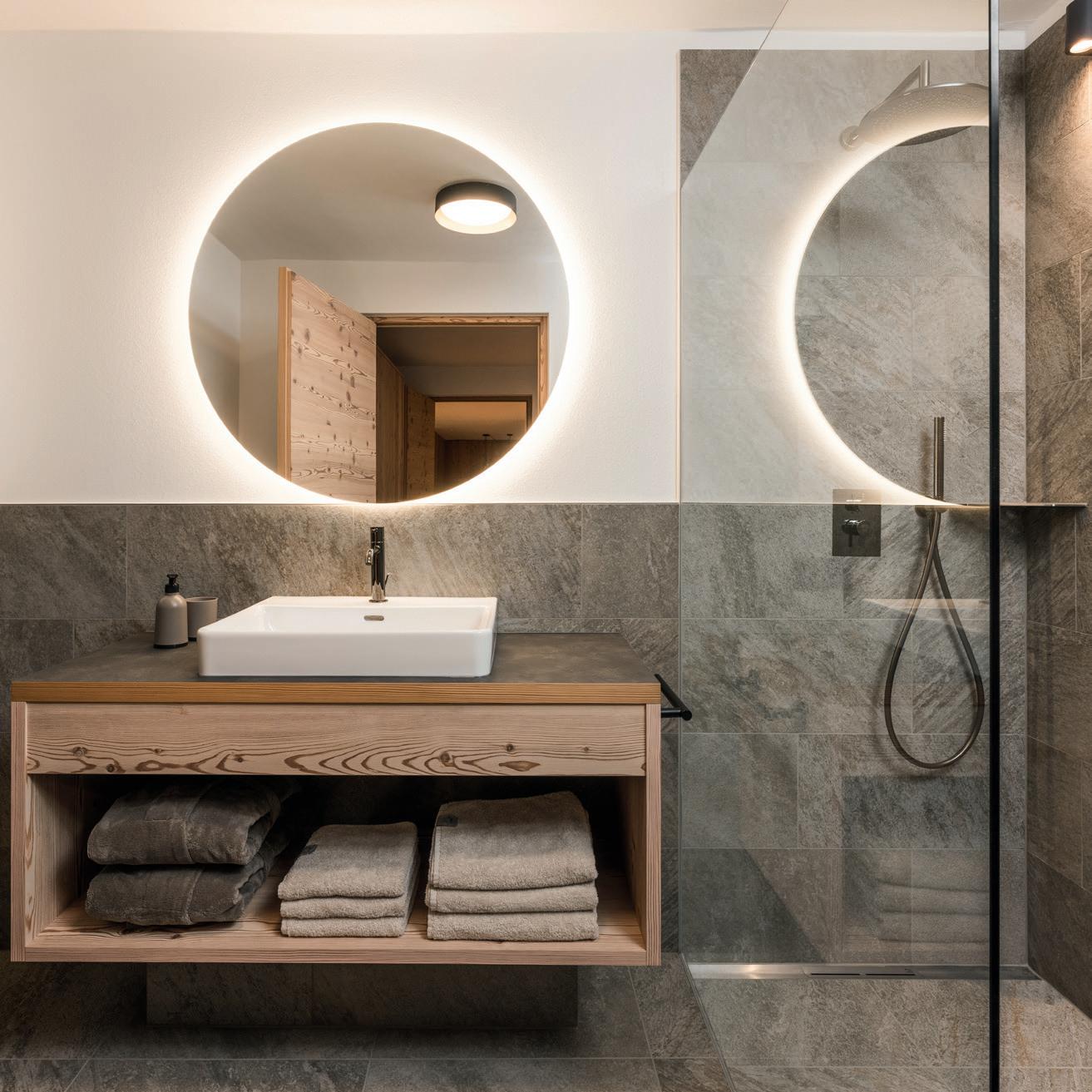 Modern interpretiertes Alpindesign im Bad –natürliche Materialien, klare Formen und indirektes Licht verbinden Ästhetik mit Funktionalität.