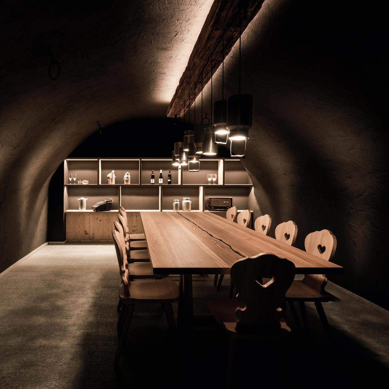 Im Erdgeschoss befinden sich Rezeption, Bar, Frühstücksbereich und Küche, die sich zu einer großzügigen Terrasse öffnen. Die alte Stube, deren historische Holztäfelung sorgfältig abgebeizt und leicht gebürstet wurde, ist heute ein besonders beliebter Aufenthaltsraum, in dem Gäste die Geschichte des Hauses unmittelbar erleben können. Für Verkostungen regionaler Produkte wie Wein und Käse bietet der Tonnen-