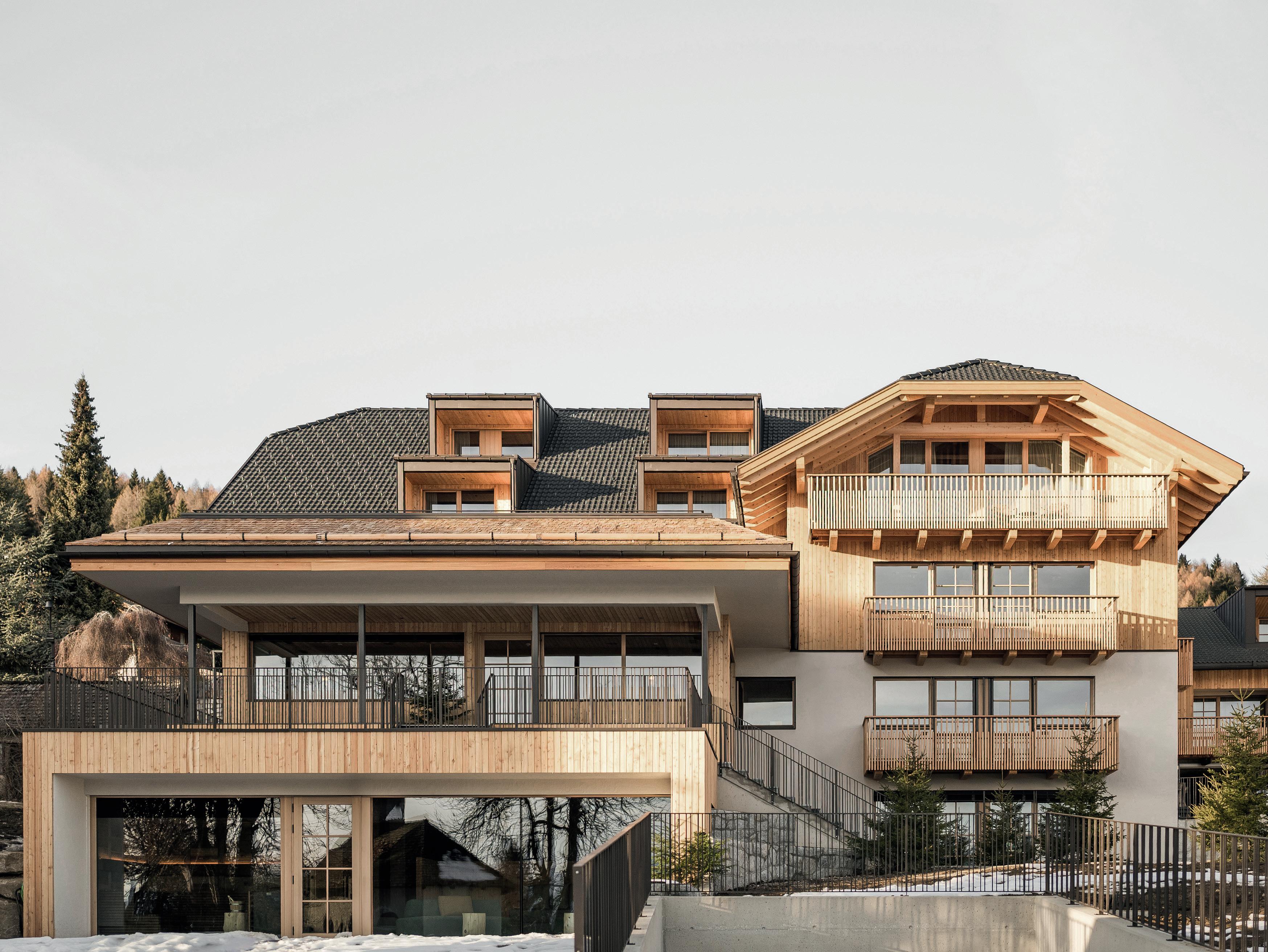 Räume für Begegnung, Ruhe und alpine Momente Ein wesentlicher Eingriff war die Neustrukturierung der Erschlie ßung: Die Zufahrt wurde vom Sü den her verlegt, Hof und Tiefgarage mit 18 Stellplätzen lassen den obe ren Hofbereich nahezu autofrei. Dadurch entstand ein ruhiger, begrünter Innenhof, der als zentraler Ort der Begegnung und gleichzeitig als Rückzugsraum dient. Das Hauptgebäude wurde auf drei Geschosse plus Dach erweitert, wobei die traditionelle Satteldachform erhalten und zeitgemäß interpretiert wurde. An der Südseite ergänzt ein zweigeschossiger Anbau den Baukörper und beherbergt den Wellness- und Spa-Bereich sowie die Allgemeinräume. Die vertikale Erschließung erfolgt über neu angeordnete Treppen und einen barrierefreien Aufzug, sodass alle Ebenen komfortabel miteinander verbunden sind.