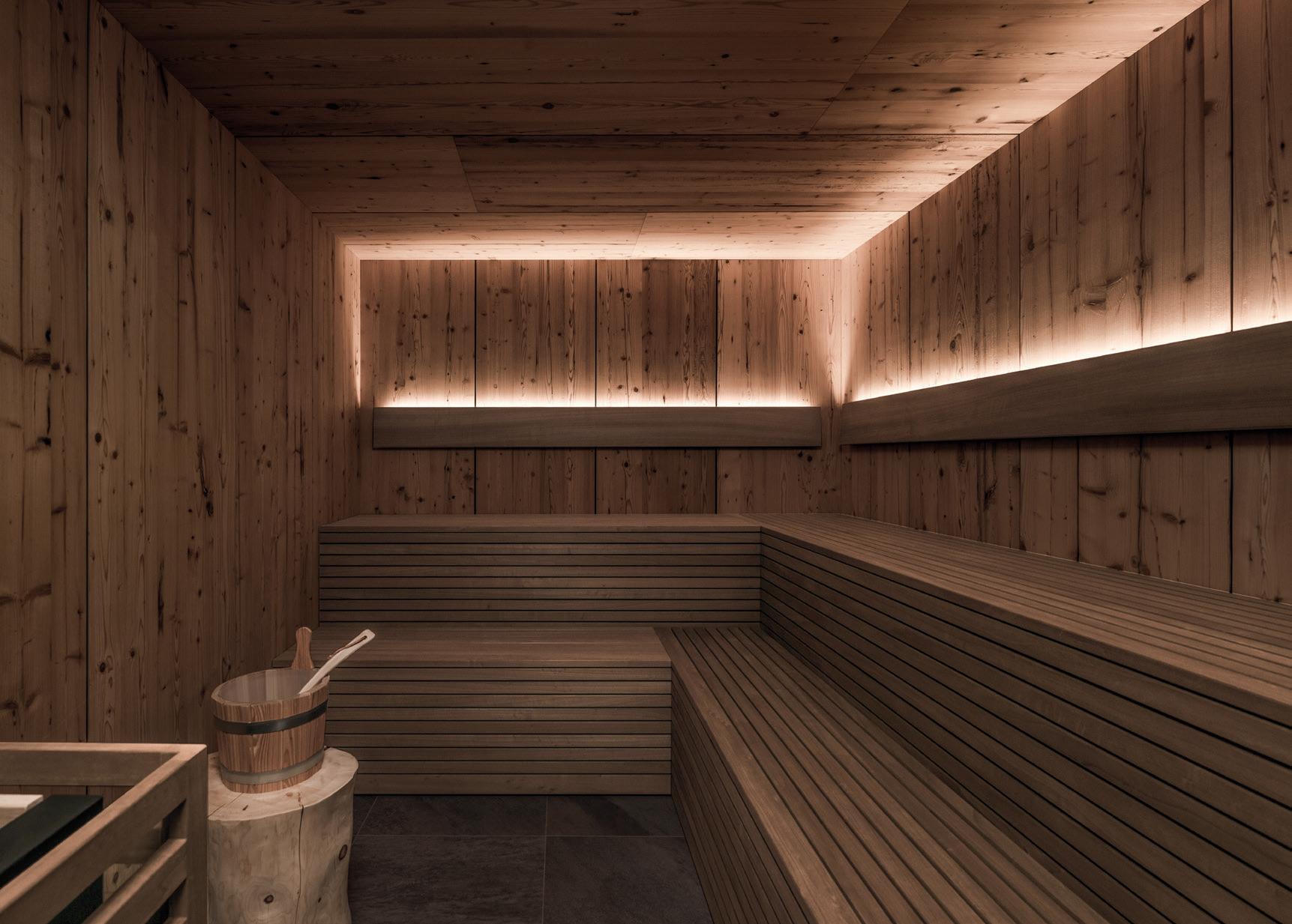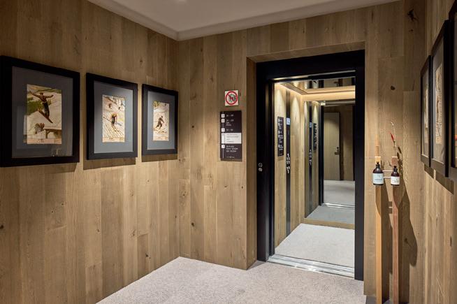 gewölbekeller ein stimmungsvolles Ambiente. Der Wellnessbereich im ersten Untergeschoss umfasst eine finnische Sauna, eine Biosauna und einen Ruhebereich mit direktem Blick auf den begrünten Hof. Vom Skiraum aus gelangen Gäste direkt auf die Piste. Außerdem gibt es separate Waschbereiche für Gäste und Betrieb sowie öffentlich zugängliche Sanitäranlagen, die den Aufenthalt besonders komfortabel gestalten.