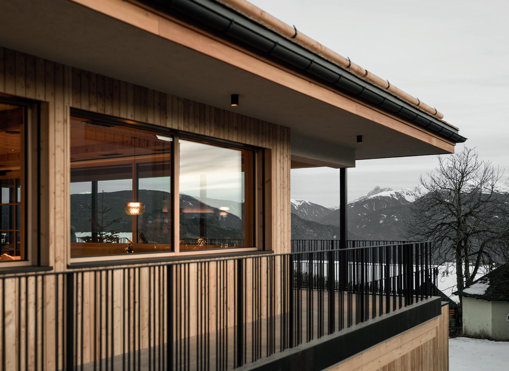 auf und fügt sich harmonisch in die bestehende Hofstruktur ein, sodass die historische Atmosphäre erhalten bleibt. Große Fenster öffnen die Räume zur Umgebung und lassen die umliegenden Berge, Wiesen und Wälder direkt ins Wohngefühl einfließen. Jeder Raum erzählt durch Materialien und Lichtstimmungen seine eigene Geschichte, die mit dem Erlebnis des Hoflebens verschmilzt. Besondere Aufmerksamkeit erhielt die Materialwahl. Fassaden und Innenräume prägen gedämpfte Lärche und Fichte. Altholz, teilweise gebürstet, um Struktur, Wärme und Tiefe zu betonen. Böden bestehen aus Lärchenholz, Naturstein oder Fliesen in Steinoptik, Fenster und Türen aus gebürsteter Lärche. Reste vom alten Haus wurden bewusst wiederverwendet und bilden gemeinsam mit dem Holz, welches selbst gefällt wurde und aus dem eigenen Wald kommt, welches direkt am Hof mit einer Wandersäge zugeschnitten wurde, die materielle und emotionale Grundlage des Neubaus. So wurden Erinnerung, Geschichte und Authentizität bewusst in die neue Architektur eingeschrieben.