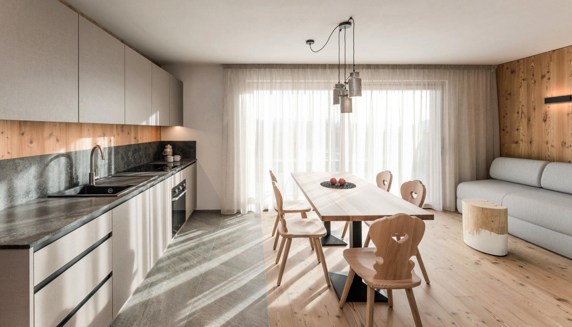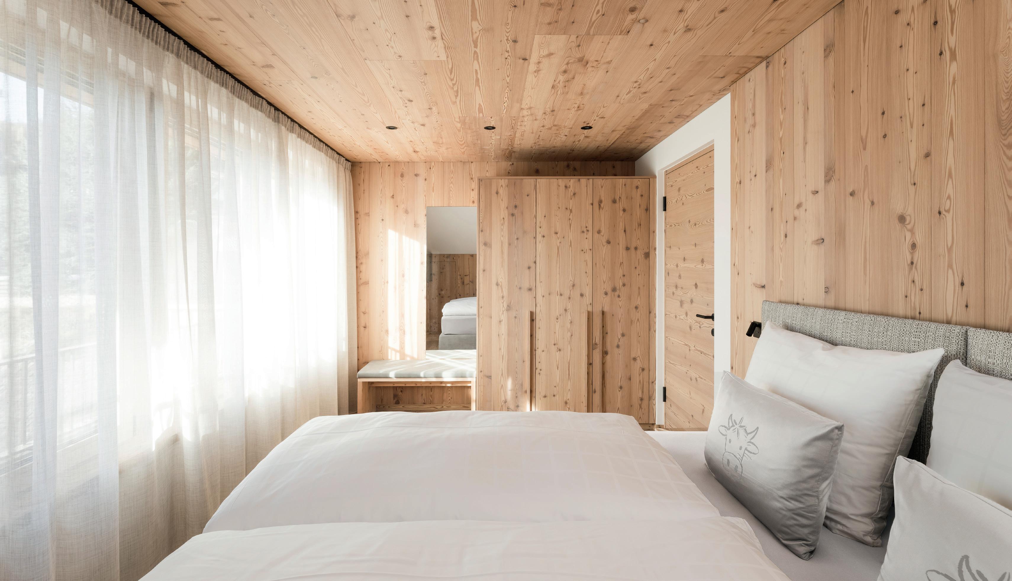 die bestehende Hofstruktur. Architektur wird hier nicht als Bruch verstanden, sondern als Fortsetzung dessen, was bereits vorhanden ist – als Weitererzählen von Geschichten, die der Ort schon in sich trägt, erklärt Architekt Stefan Gamper. Durch die Neustrukturierung entstanden neun Ferienwohnungen mit insgesamt 46 Betten sowie eine zweigeschossige Betriebswohnung für die Familie. Jede Wohnung verfügt über einen