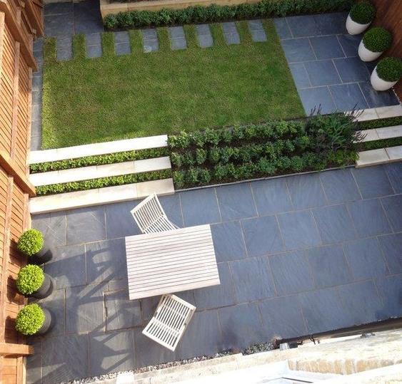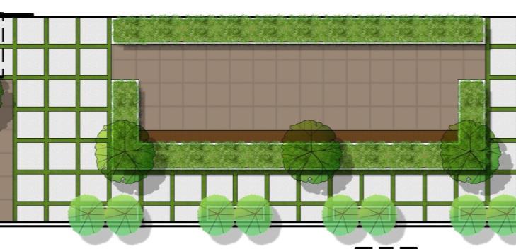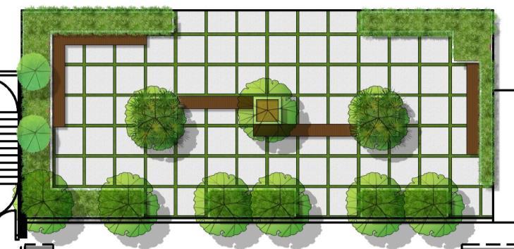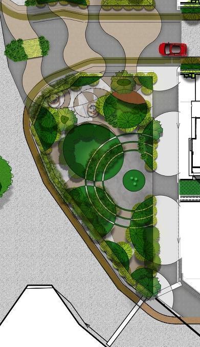 Geometric style and patterns conveyed through hardscape and planting