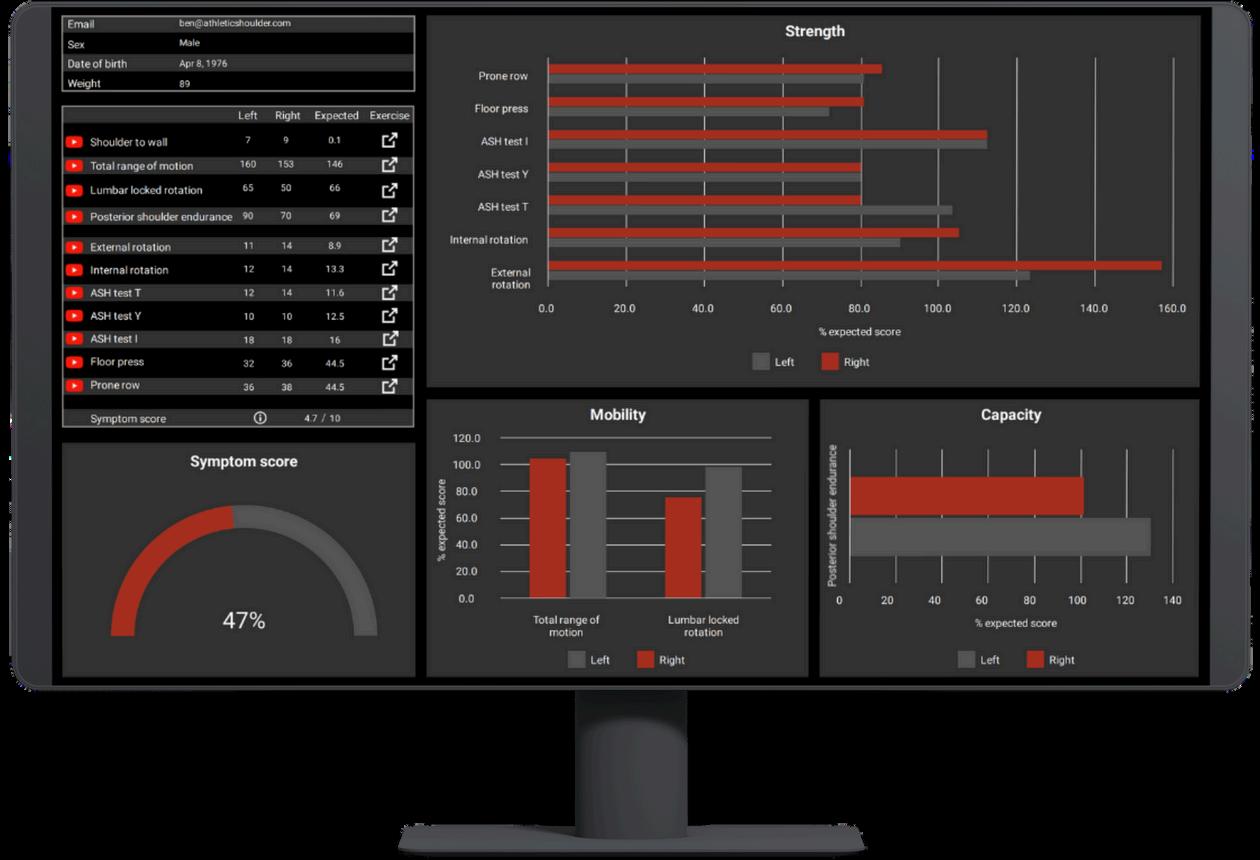 values are based on your profile Strength scores: 100% is your expected strength level Start some of our recommended exercises straight away to address any restrictions or weaknesses Limited total range of shoulder rotation increases the chances of developing shoulder injuries A throwing athlete needs enough range to speed up / slow down the shoulder A lack of range means higher load and extra strain on the shoulder Shoulder to wall: Even slight limitations in overhead flexibility can increase the risk of elbow injuries by 300% Posterior shoulder endurance test: Building your shoulder endurance enables you to tolerate higher intensities for longer periods and is often overlooked in rehabilitation or strength training programs For example a tennis player with limited endurance may struggle to maintain high velocity serves in later sets Rotator cuff strength: Weakness of the rotator cuff has been implicated with an increased risk of subsequent injury and pain Athletic shoulder test: long lever positions mimic a number of sports This helps show how strong your shoulder is in positions that closely resemble your actual sport or activity Symptom score: To track how much your symptoms are getting better we use a tool called the Patient Specific Functional Scale (PSFS) With this scale, you choose three activities that are important to you and rate how well you can do them on a scale of 0 to 10 A score of 0 means you can't do the activity at all while 10 means you can do it just as well as before your injury or issue Your overall score, shown in your report as a percentage, is the average of these three scores A score of 100% means you rated all three activities as 10/10 5 rep max floor press and prone row: Athletes who can’t push or pull the expected % of their own bodyweight in each hand are more likely to get injured