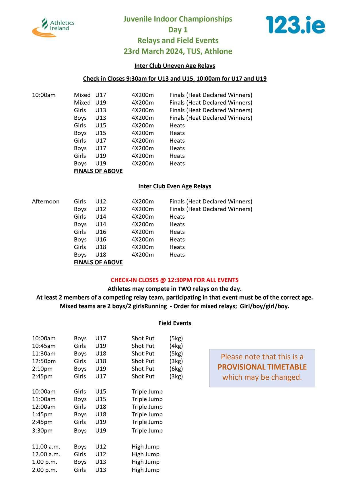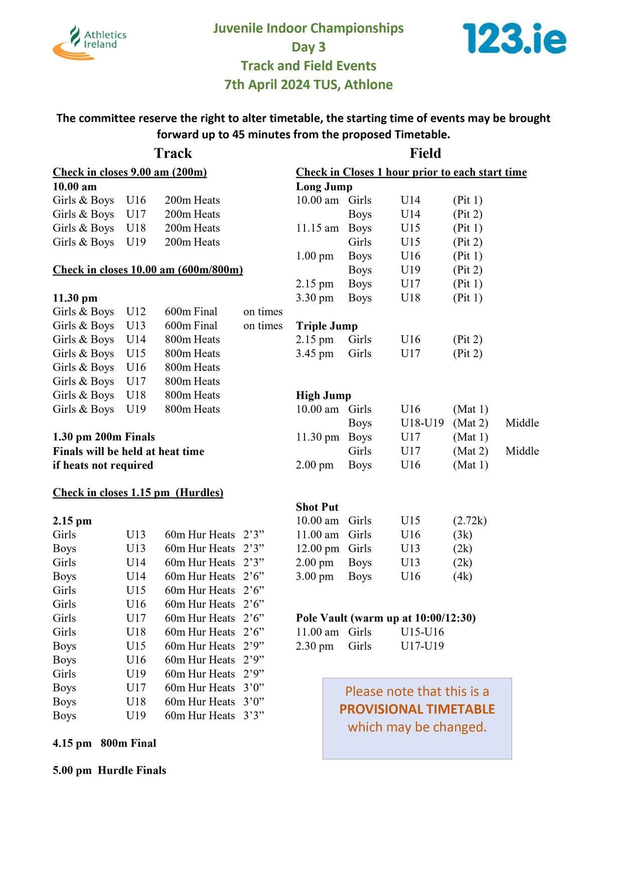 Thank you to our sponsors, 123.ie your support is welcomed. Thanks to all of the volunteers at Club, County, Regional and National level for their great work encouraging and promoting the development of the young athletes. Thanks also go to the officials working at the Championships, they give of their time freely to ensure the smooth running of the events and this is very much appreciated.