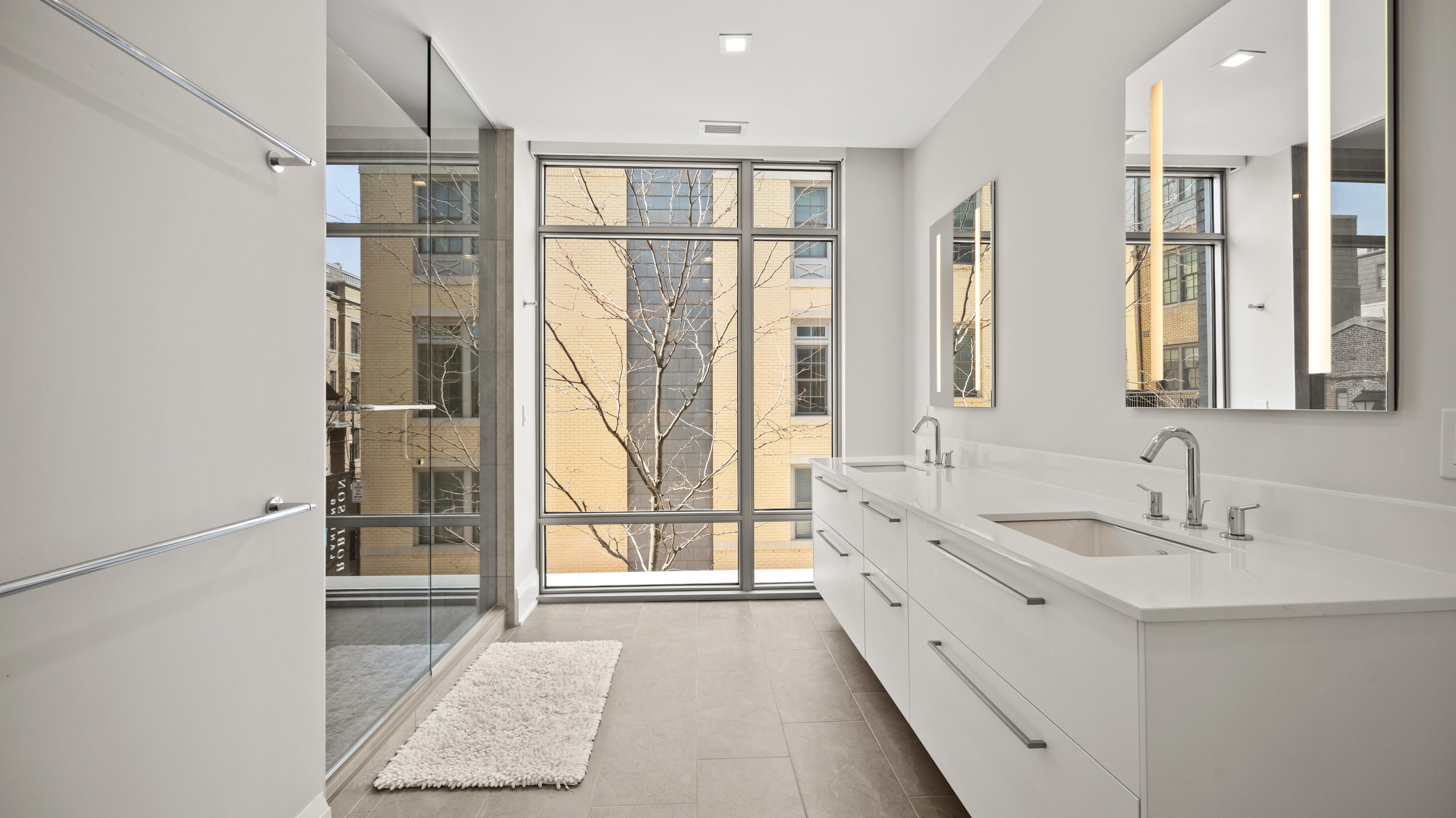 Your private quarters? Take the elevator or stairs one floor up, ring your doorbell just for fun, and then open your door to be greeted by that new home smell. Drop your keys, bags and shoes in your foyer before deciding where to unwind. This unit has a powder room and extra coat closet off the entryway, so friends don’t need to use one of the restrooms in your bedrooms.