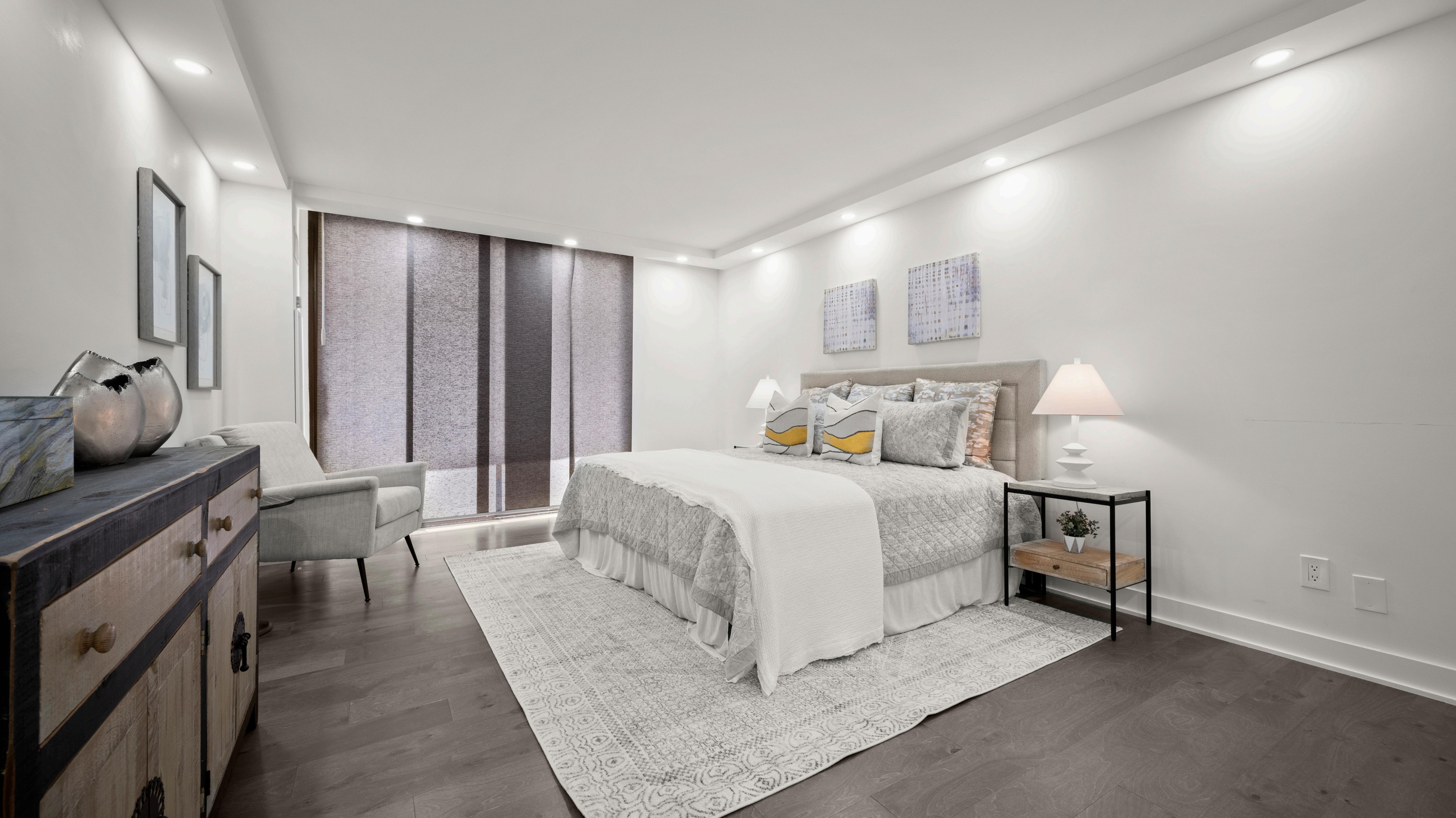 the wet bar, or spill out onto the 40 foot balcony. It opens off the living room, but also from the master bedroom for some fresh air with your morning coffee instead. Custom blinds worth $5,000 already installed throughout, also mean you can just shut out the whole world and sleep in. Have you see these bathrooms? The master is only slightly larger but just as stylish, while the closet is going to be hard for you to fill with your favorite looks.