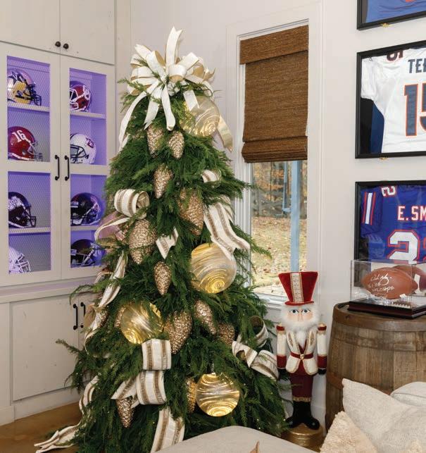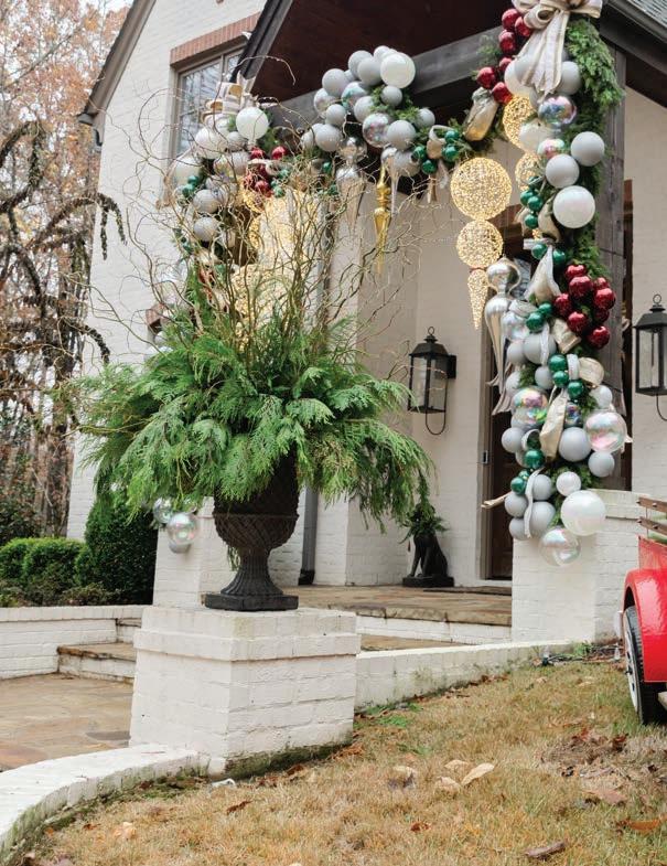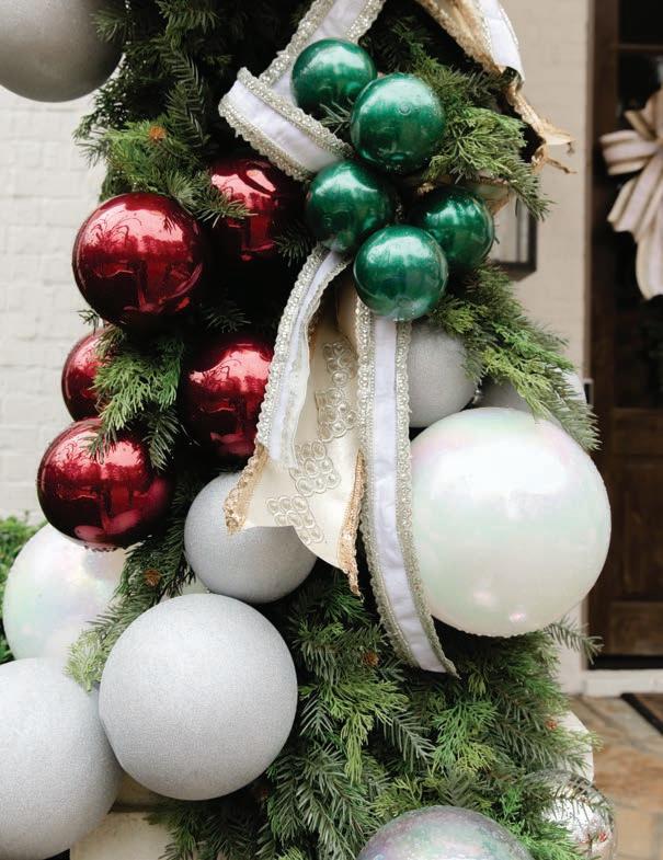 The seasonal decor starts in the front yard. The focal point of this year’s look is a festive garland that traces the dark wood beams of the white brick home’s covered entry. Elegant ball ornaments dress the greenery up in iridescent and pearly tones as well as the deep jewel tones of the season. Oversized illuminated finialshaped ornaments take the festive mood up a notch, setting the stage for the celebration just inside the front door.