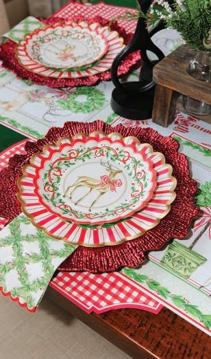 In a novel twist that’s both merry and stress-free, Sharpe outfitted the entire tablescape in luxurious paper products from his Germantown retail store, John Mark’s. “They’re fun and they’re easy,” he explains, “and you don’t have to be married to anything. Paper is great to layer on the table— the liner, the table runner, the plates, the napkins, everything. We used a lot of paper cutouts, too.” He adds that having a variety of inexpensive paper products provides a great way to involve children or grandchildren in the decorating process. “They can help set the table, mix and match colors and patterns; it can be a creative outlet for everyone. And the clean-up is easy, too.”