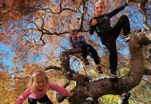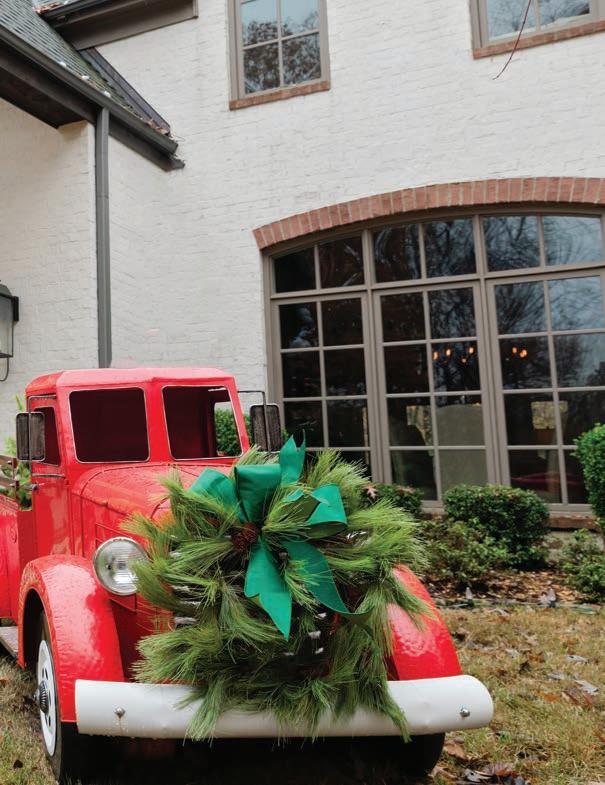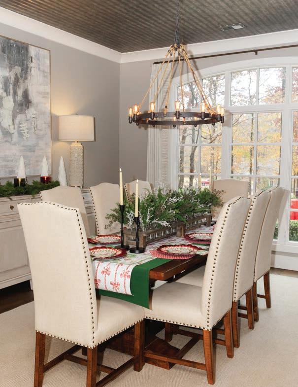 Theliving room features an open concept, leading to the informal dining area and kitchen. Sharpe carried the red-andwhite aesthetic onto the farm table, creating a centerpiece of greenery, more glittery red orbs and icy branches. Fun accents including mini retro-style ceramic Christmas trees play well with the Chandlers’ Etta B Pottery holiday dinnerware.