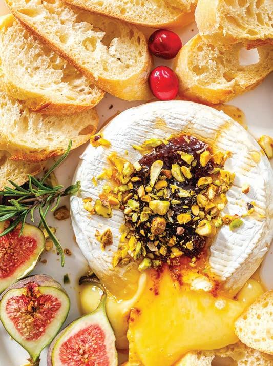 Spoon the half cup of fig jam evenly over the top of the brie wheel, spreading it almost to the edges. Sprinkle the quarter cup of chopped pistachios over the jam.