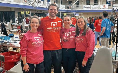 BECKY BARKELEW, DR. TAYLOR REED, CHRISTY SMITH AND JAELON HITT WITH REED FAMILY DENTISTRY VOLUNTEER AT THE ANNUAL MID-SOUTH MISSION OF MERCY EVENT, PROVIDING FREE DENTAL CARE TO THOSE IN NEED.