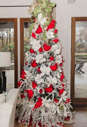 The visual experience continues into the adjacent living room, where Sharpe dressed up the stone fireplace in a scale that complements its grand size. More festive balls, here in reds and grassier greens, line the mantel and spill all the way to the floor, reflecting the over-thetop joy the season represents. Across the room another Sharpe creation sets a different mood. Flocked and dressed in snowy magnolia blossoms, this tree is home to a flock of vivid red cardinals. The nod to nature makes perfect sense, as it’s set against one of the full-length windows that line the room’s back wall. Thanks to its rural setting, the Chandlers’ backyard is home to a variety of birds and other wildlife.