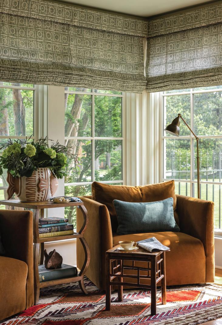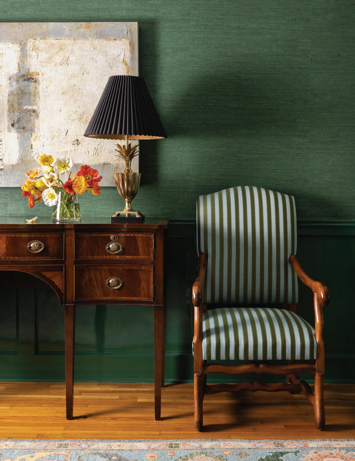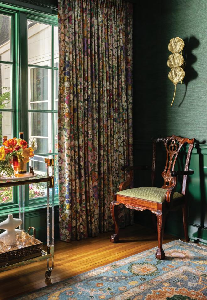 Thedining room windows look out over the backyard and park-like garden. “Bonnie said she wanted to have flowers all year round,” says Engelberg, who obliged by giving her client a space that feels like an extension of a verdant outdoor paradise. Green grasscloth lines the upper portion of the walls while rich lacquered paint in the same lush color covers the lower half, as well as the trim. House of Hackney Hollyhocks drapes fill the room with vibrant flowers. The lighting is also natureinspired—a show-stopping linear chandelier with gold stems and crystal flower buds hangs over the dining table and gingko leaf wall sconces provide additional light.