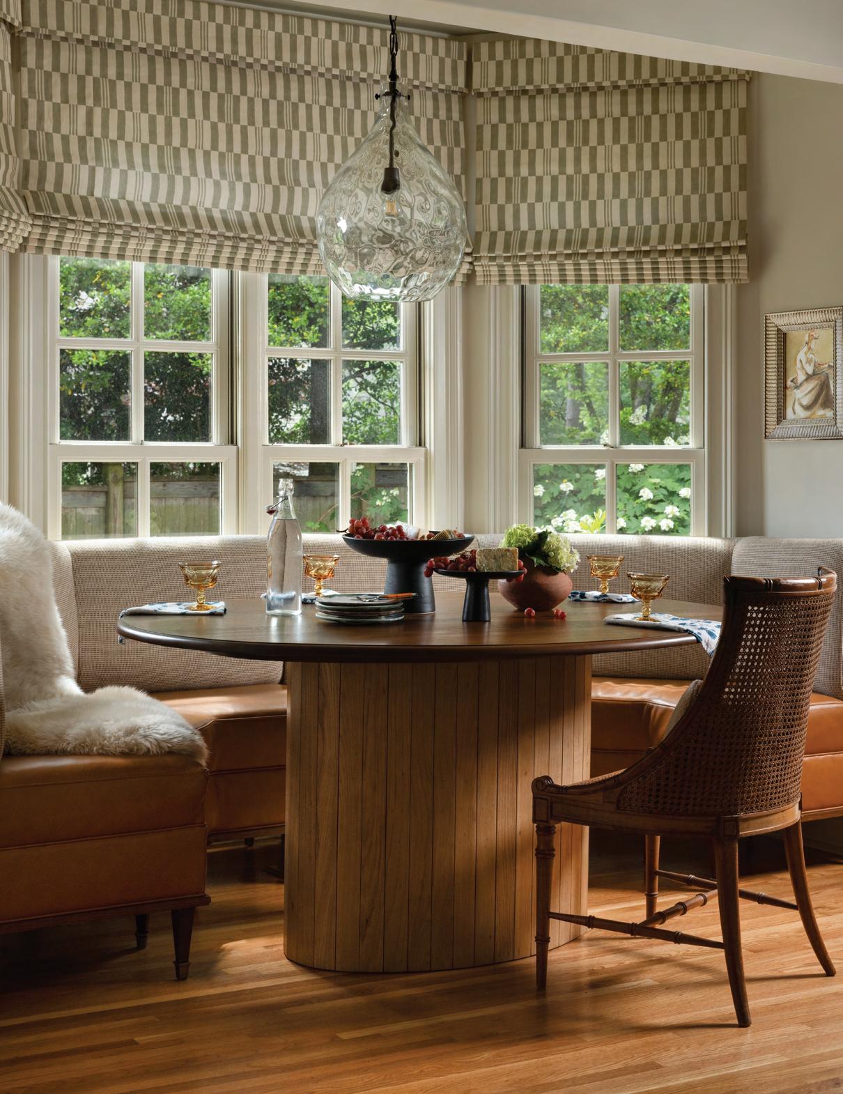 Thekitchen opens to a cozycoffee nook at the front of the house and a comfortable family room at the rear, so Engelberg added touches that would give those two areas a feel more in keeping with the new look of the space between them. The sunny nook got fresh paint, including a soft green ceiling paint treatment, Farrow and Ball Vichyssoise, that is repeated on the family room, and new Roman shades on its three walls of windows. The McLaurin & Piercy fabric, inspired by Indonesian wood carving, adds an eclectic element to the space that speaks to the Thorntons’ wide range of tastes.