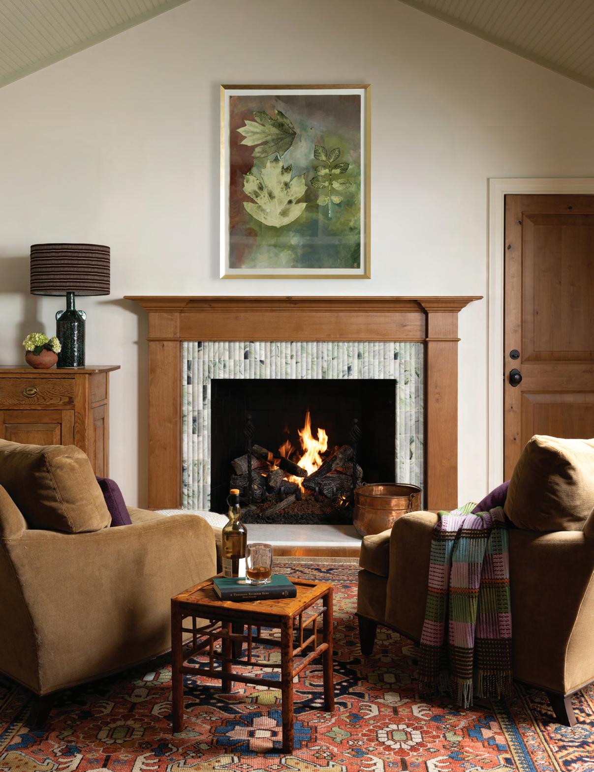 The family room fireplace received a full makeover. In place of a more elaborate surround with a built-in nook for an old-style box television, Engelberg designed a more clean-lined alder wood mantel accented with cabochon dimensional tile from Cle Tile’s Lapidary line. The redo also included replacing a breakfast table and chairs beside the room’s large bay window with an oval table built locally by Daniel O’Grady of O’Grady Custom, and a made-to-fit banquette. The designer again chose Roman shades for the bay, this time in a stylized pistachio stripe from Kirkby Design.
