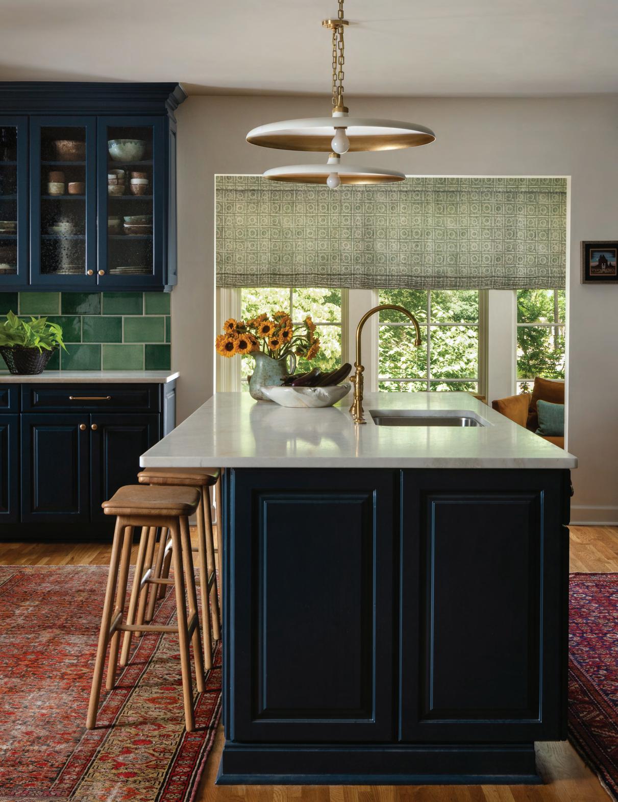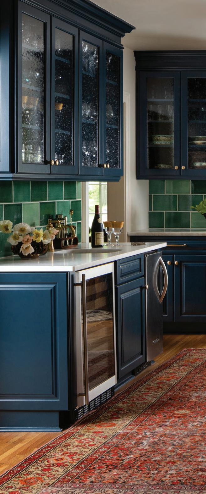 Engelberg’s starting point for the kitchen design is classic deVol, handmade rectangular tiles in an assortment of glossy emerald green shades. Says the designer, “What I love about the tile is not only the variation in the color, but the scale of it. It’s such an unusual scale and not a typical subway shape.” She chose Hague Blue, a deep blue from Farrow & Ball Paint, for the existing cabinetry, and kept the Thorntons’ red oriental rugs on either side of the island. White marble countertops look fresh and crisp with the otherwise vibrant palette.