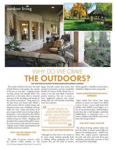 Although you don’t have to be outside to be active, being outdoors generally leads The perks of greener environs reach to walking, biking, gardening and other far beyond simply making us feel activities that put the body in motion, 70 | At Home Memphis & Mid South • June 2014