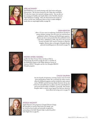 After a 15-year career in marketing, Linda Benton decided to pursue freelance writing. Over the years, her work has been published in Blush, CityScope and HealthScopem agazines. Benton says she is most proud of her first published article - Lily’s Story. Published in 1998, Lily’s Story is the personal account of Linda’s 1997 travel to Vietnam to adopt her daughter. Benton takes us through a Memphis familys personal remodeling process this month on page 56.