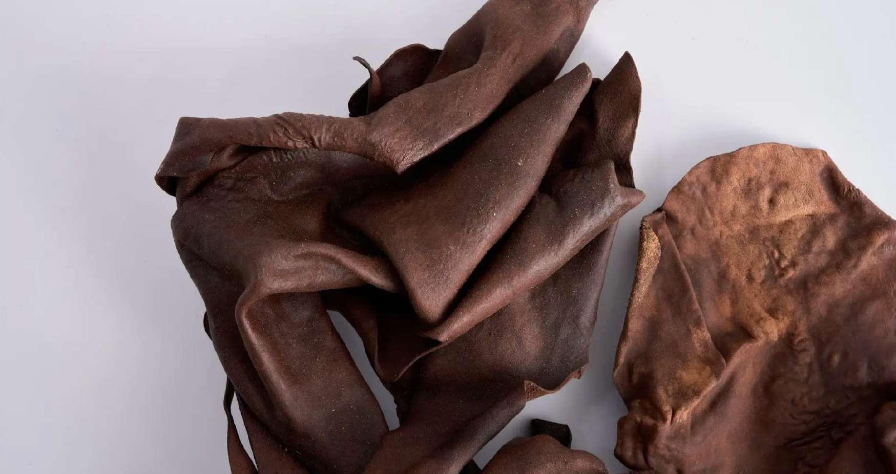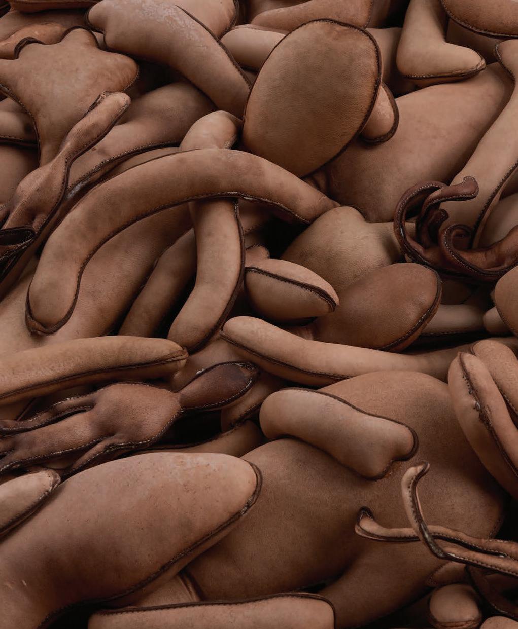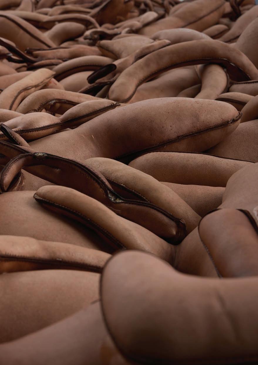 Monochromatic hues of brown spread across the space, where wrinkled leather fragments extend like a charged network of nerves. Their formation suggests another sort of flocking, echoing motifs in Alghamdi’s lexicon: remnants and residues that gesture toward what has been discarded.