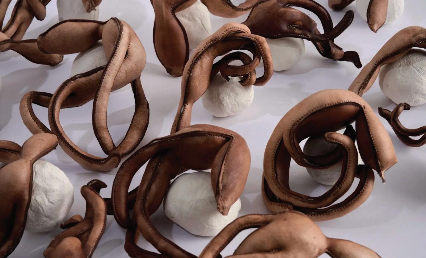 Shards of Quiet Strength includes leather and clay pieces arranged at the center on the ground and spreading outward toward the edges of the space and wall. A rounded clay form rests at the core, and is partially enveloped by leather pieces whose outward movement suggests a molecular expansion: figures multiplying, flocking, clustering, and dispersing in quiet rhythm.