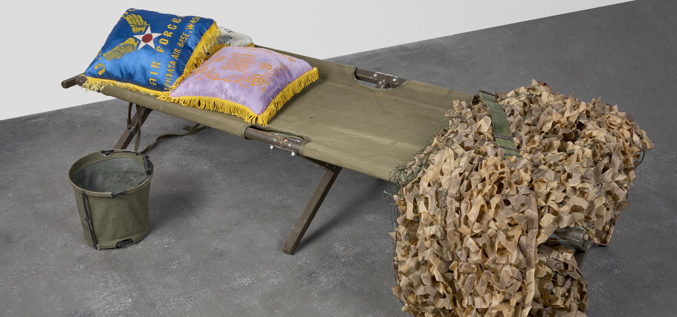 Other routine items have been transformed through brilliant beads and vibrant yarn wefts. These beaded and yarn woven objects—be they satchels, binoculars, clocks, helmets, water bottles, or other such carry ons—are designed with the symbols and iconography of the Gulf War—medals, flags, warplanes, insignias, and Arabic words—in a manner that recalls 8-bit pixel styles and quilt patternings, which in turn serves to emphasize dissonant innocence and clinical battle sadly crisscrossing.