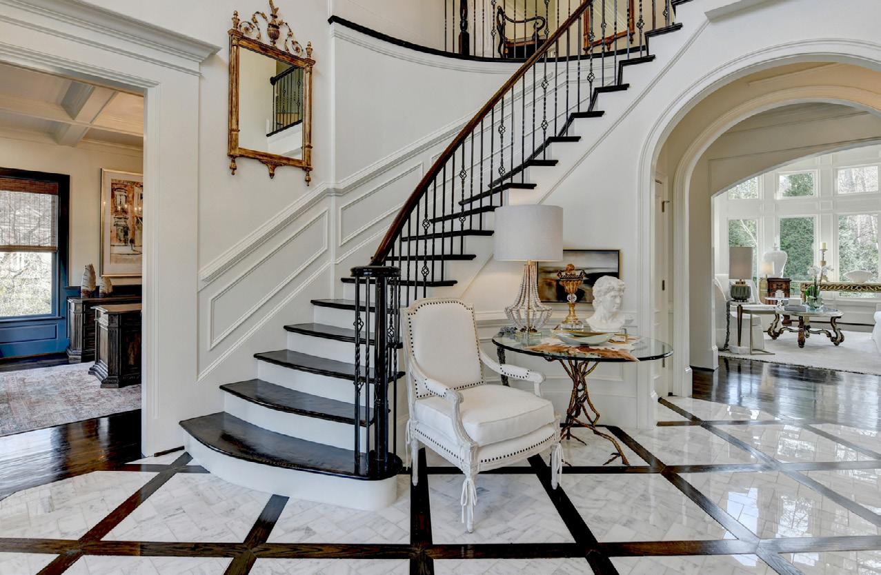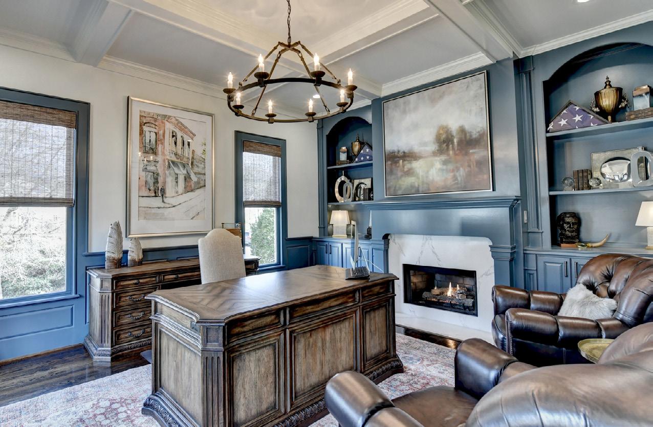 This elegant white brick traditional home blends timeless curb appeal with fully updated modern luxury. The grand foyer features a chandelier, marble floors and a stunning staircase. A formal dining room is highlighted by sophisticated lighting. Off the entry, a refined office with fireplace and built-in bookshelves provides a quiet retreat. The expansive two-story living room, anchored by a wall of windows and fireplace, flows seamlessly into a chef’s kitchen with custom wood hood, gas range, island, stainless steel appliances, beverage refrigerator, granite countertops, breakfast area and butler’s pantry with custom shelving. A fireside keeping room opens to a covered, screened porch with fireplace, outdoor cooking station and dining space, ideal for year-round entertaining.