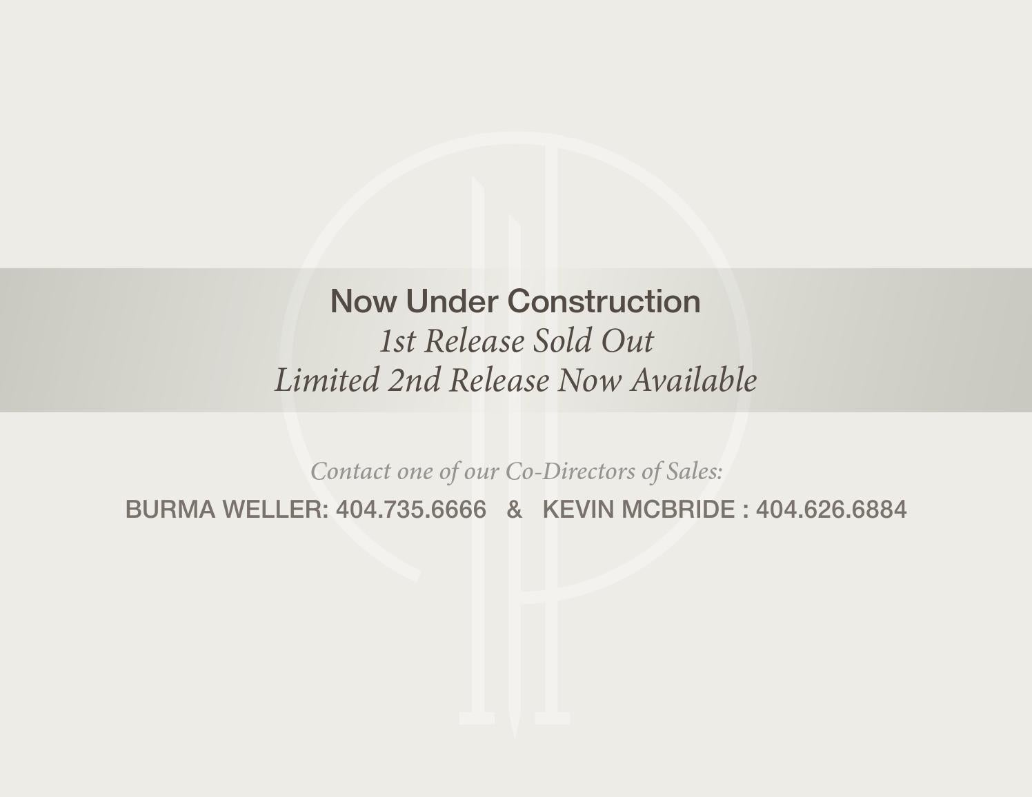 Now Under Construction 1st Release Sold Out Limited 2nd Release Now Available Contact one of our Co-Directors of Sales: BURMA WELLER: 404.735.6666 & KEVIN MCBRIDE : 404.626.6884