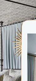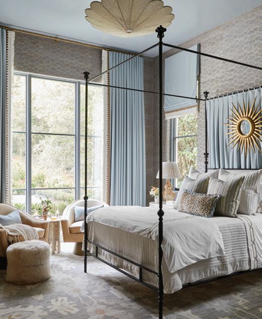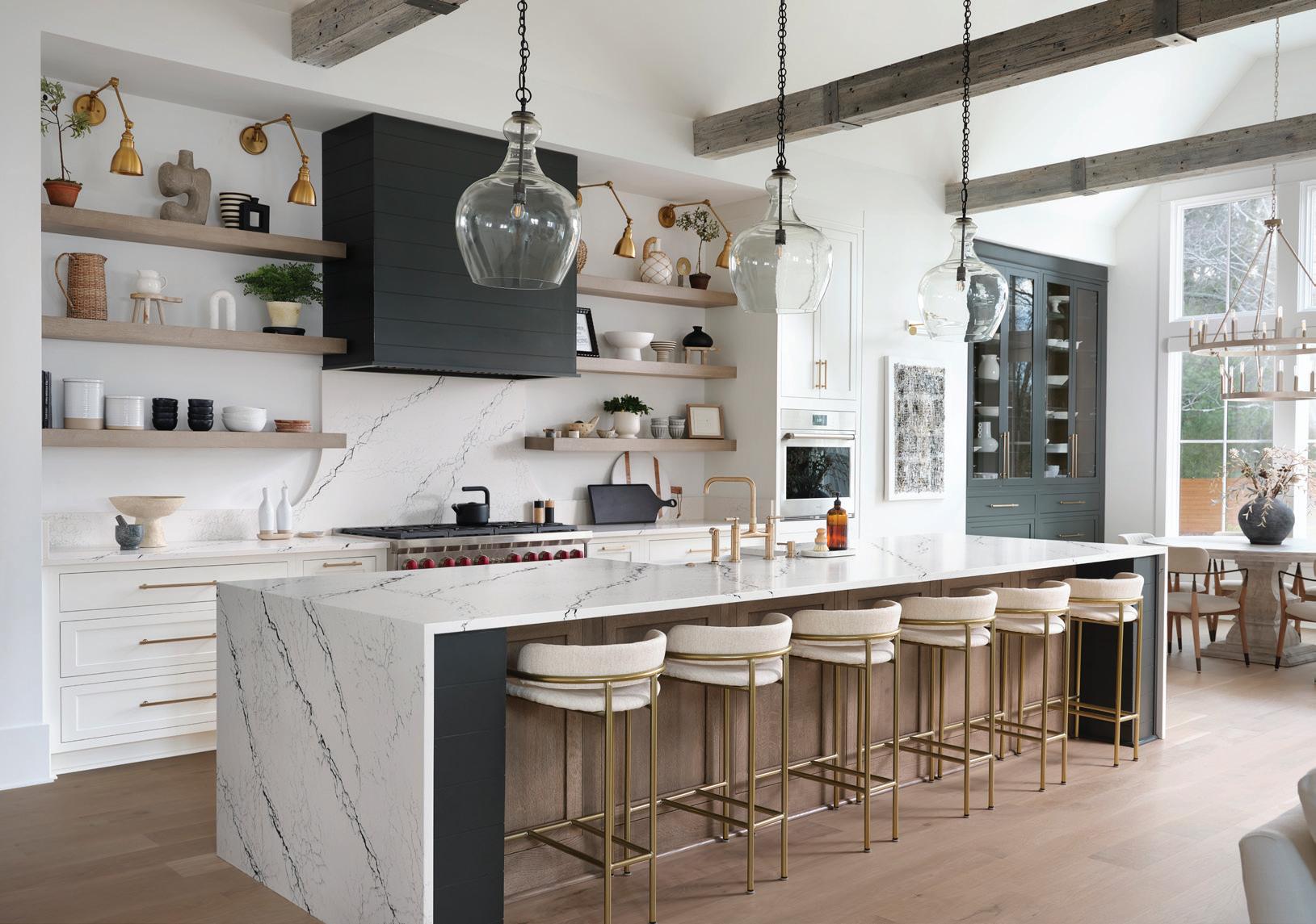 Kitchen designer Stephanie Elder of Dove Studio was thrilled to join forces with Hrach Burtoyan of Keystone Custom Homes for their latest custom build project just outside of Atlanta. The kitchen boasts elegant soft white and deep moody gray painted inset cabinetry and stained oak island cabinets and accents, harmonized with stained wood ceiling beams and brass hardware, capturing the essence of a modern farmhouse aesthetic. To highlight the homeowner’s eclectic collection of art and accessories we added floating shelves flanking the custom range hood. The kitchen also features a hidden co ee bar and custom appliance storage cabinet as part of the built-in fridge armoire. A spacious island takes center stage, catering to the needs of the family and suited to the large open floor plan. In addition to the kitchen, Dove Studio provided custom designed cabinetry for the o ce, mudroom, bar, laundry, and bathrooms.