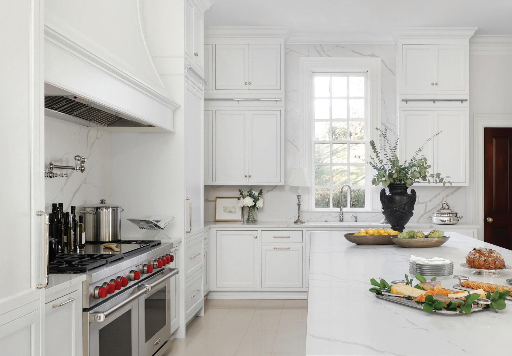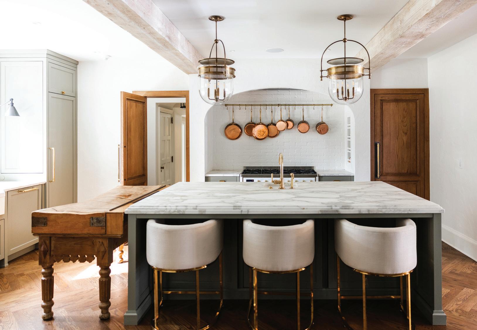 This iconic English Manor estate from the 1920s has undergone a meticulous transformation in collaboration between Studio Entourage and Wolf Design Group The original kitchen has been expanded and seamlessly integrated with the family room to create an ideal workflow. Our vision was to craft a modern and functional kitchen that harmoniously blends with the vintage charm of the 1920s home. Stained wood panels conceal the refrigerator and access to the “back of house” area, while the original brick and plaster structures are retained, providing a fitting backdrop for the authentic Ilve brass and ivory range. A new steel window at the working sink introduces natural light and o ers expansive views of the front yard. The addition of a herringbone wood floor seamlessly connects with the original bowtie joint hardwoods. The use of brass fixtures, neutral tones, and beautiful Calacatta marble create a calming space to nurture culinary creativity.