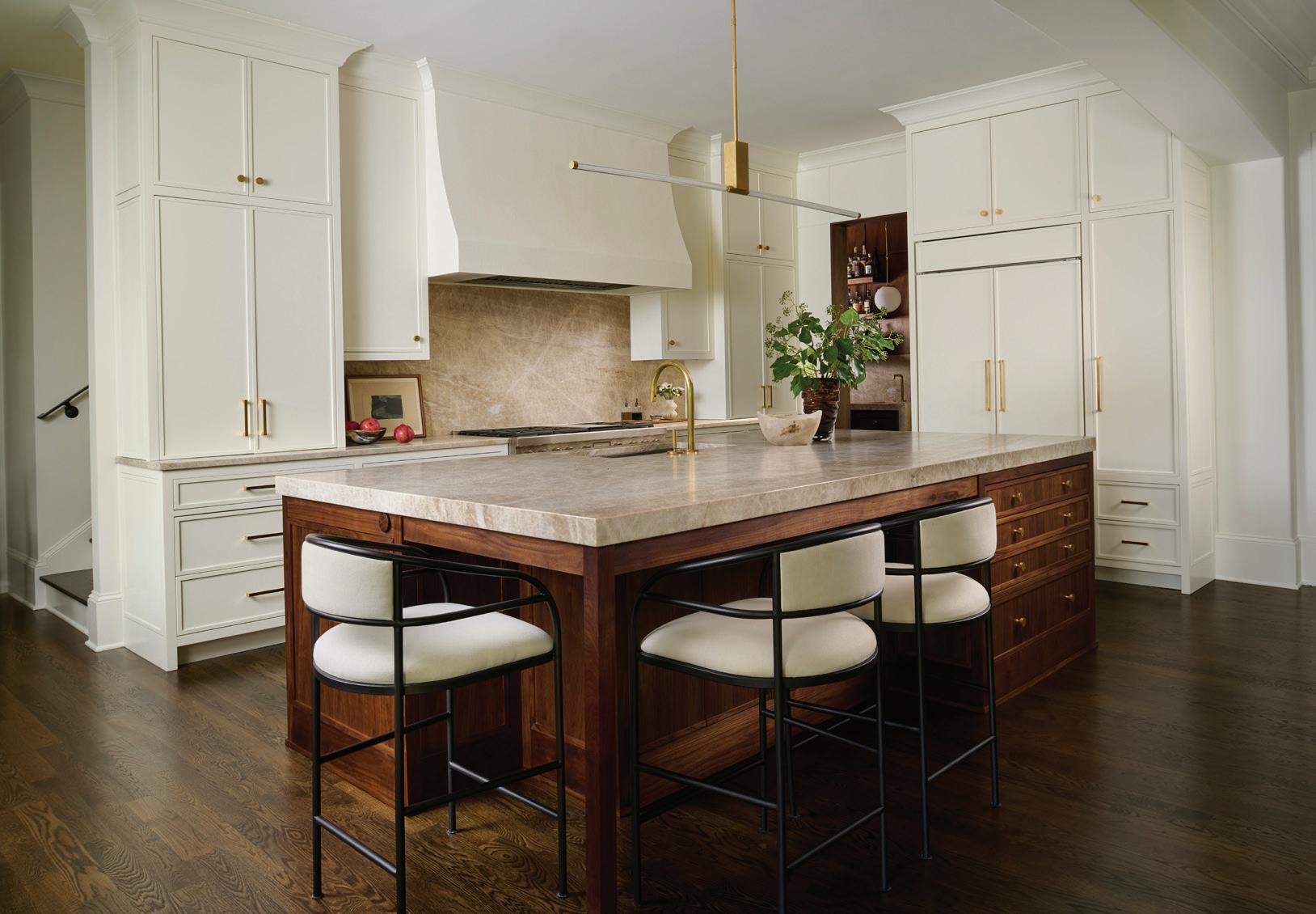 This kitchen and house as a whole was the epitome of traditional design when the clients moved in. The goal was to maintain the classic bones of the home while integrating sleek design elements and finishes that fit with the homeowner’s more transitional taste. A symmetrical design layout alongside inset cabinetry, a plaster hood, unlacquered brass hardware, and a linear light fixture created a visually calm and clean aesthetic. Meanwhile, a walnut island with Taj Mahal Quartzite countertops and backsplash grounded the kitchen in its traditional roots.