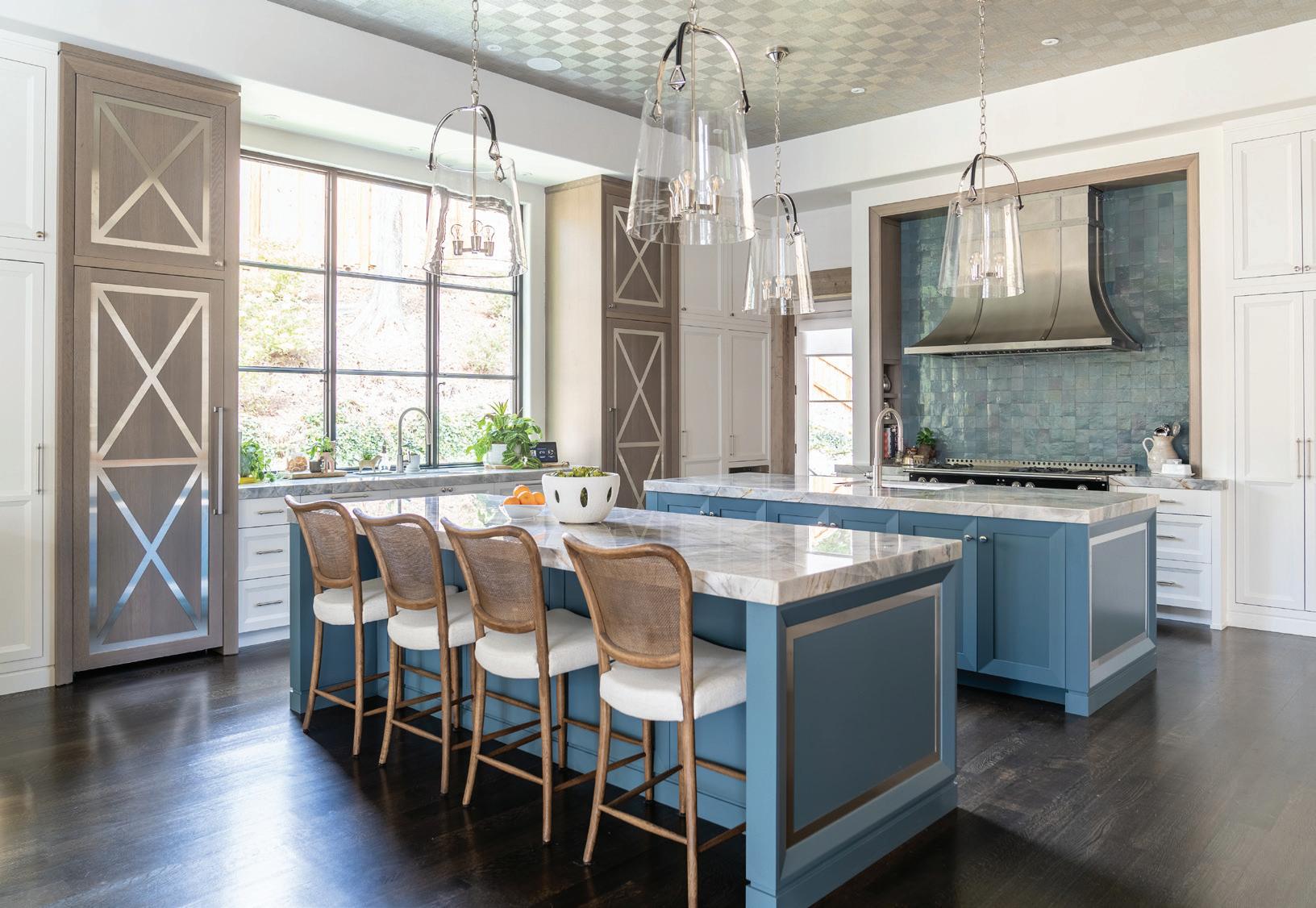 This colorful kitchen underwent a big transformation from a small undersized space to the vibrant, open area that it is now. The homeowners purchased a new home and lived there as-is for a short time before realizing the kitchen was undersized for their needs. They decided to renovate the kitchen area, allocating more of the existing space to the kitchen. The layout and placement of appliances and task zones were reworked, two islands were added, and a co ee room was created to the side of the kitchen. A bourbon and wine room with a backlit countertop and backsplash was also added as a key feature adjacent to this space. The homeowners’ love of color and texture drove the design with the use of deep blue and gray. These colors were used on portions of the cabinetry as well as on rift oak panels for built-in refrigeration and sliding barn doors leading into the beverage room. Zinc metal accents and banding were added to the island ends and the oak doors and panels to complement the new stainless zinc hood. The range area is surrounded by a dark blue tile to bring in the colors from the rest of the kitchen and the natural quartzite countertop pulled in amazing tones of blue, gray, and taupe to unite all elements of the color scheme.