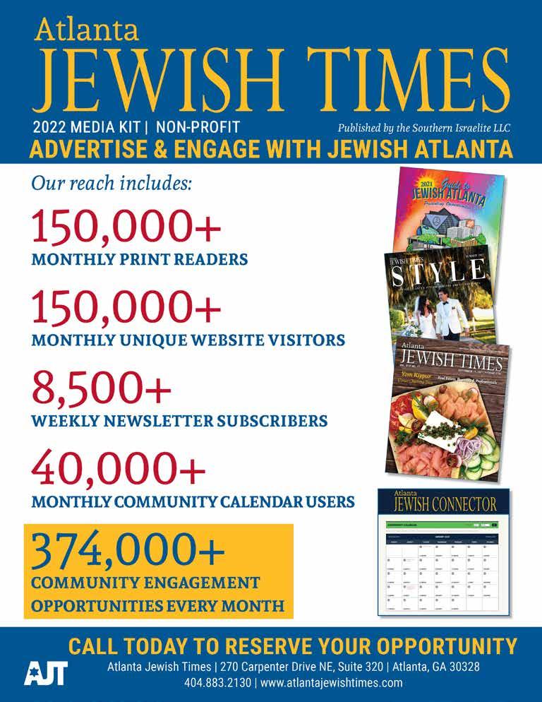 In addition to this print version of the 2022 guide, there’s an online resource directory for viewing throughout the year within the Atlanta Jewish Connector, www. AtlantaJewishConnector.com. Many consult the Connector for event planning as well as to learn what is happening around Atlanta socially, spiritually, educationally and culturally.