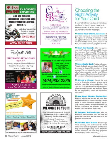the Best Match: Be thorough when choosing your child’s activity. Don’t settle for a teacher or program just because they are in close proximity to you. Interview several instructors and visit many programs before making a final selection. c atlantaparent.com