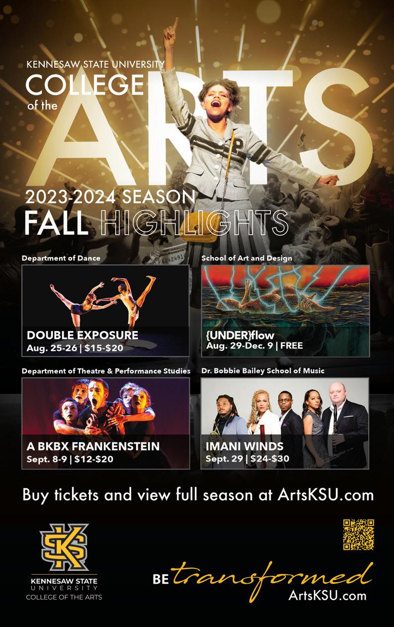 The College of the Arts at Kennesaw State University (ArtsKSU) is pleased to announce the 2023-2024 ArtsKSU Season, featuring the School of Art and Design, the Department of Dance, the Department of Theatre and Performance Studies, and the Dr. Bobbie Bailey School of Music. Interim Dean Harrison Long said, “The arts at KSU are essential to the cultural fabric of our institution and to greater Atlanta. We invite patrons to join us for our numerous offerings this fall.”
