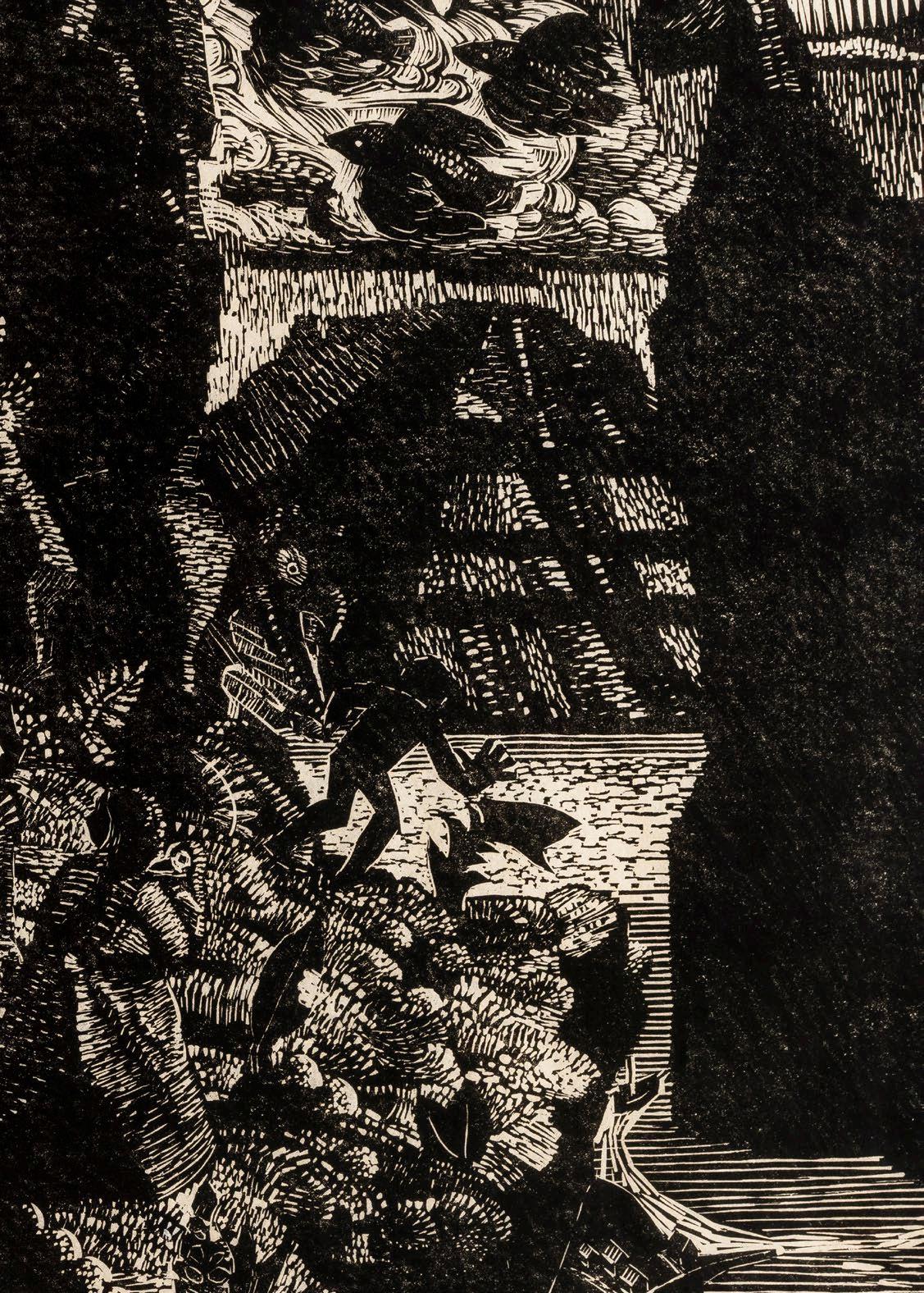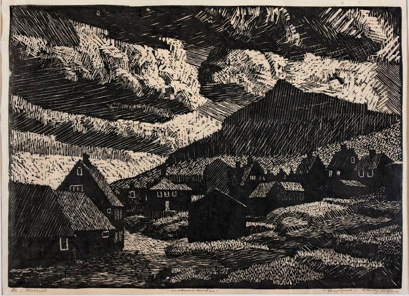 Elinborg Lützen (1919–1995) was the first and for a long time the only Faroese printmaker. Her favoured technique was the linocut, from which she elicited great riches with a varied cutting technique and black tones. From expressionistic fairy tale pictures, she moved over into a classic expression of motifs of villages and common life. These were followed by surrealistic phantasies of a mythic underworld, often under-sea: Submarine Faroes! The artist lived and worked for most of her life in Klaksvík.