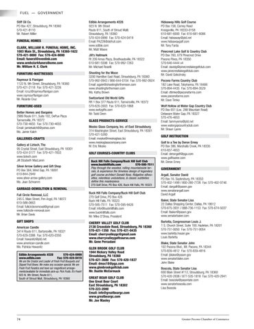 Edible Arrangements #228 923 N. 9th Street Route 611, South of Stroud Mall) Stroudsburg, PA 18360 570-424-0999 Fax: 570-424-0419 Email: PA228@dofruit.com www.edible.com Mr, Matt Moore Jill’s Hallmark Rt 209 Ames Plaza, Brodheadsville, PA 18322 610-681-5598 Fax: 570-992-7263 Mr. Michael Roselli Shooting for the Moon 3200 Hamilton East Road, Stroudsburg, PA 18360 570-992-0943 / 866-644-0104 Fax: 570-992-0924 Email: agate@shootingforthemoon.com www.shootingforthemoon.com Ms. Kathy Brown Switzerland Old World Gifts RR 1 Box 377 Route 611, Tannersville, PA 18372 570-620-2003 Fax: 570-620-1868 www.switzgifts.com Mr. Todd Deen