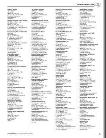 John Roberts 1245 Chestnut St Lebanon, PA 17042-4519 717-273-7913 F: 717-273-2922 E: jrobertslvg@gmail.com Michelle Tuscano 2231 Lebanon Valley Mall Lebanon, PA 17042-2589 717-274-2564 F: 717-274-1284 E: mtuscano@lebanonvalleymall.com www.lebanonvalleymall.com Audrea M. Zechman 811 E Main St Annville, PA 17003-1605 717-383-2511 E: audrea@lebanonvalleymessage.com www.lebanonvalleymassage.com Dale Yingst 1341 E Main St Palmyra, PA 17078-9515 717-838-1313 F: 717-838-1831 www.lebanonvalleyhomes.com