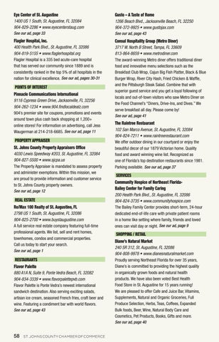 The Raintree Restaurant 102 San Marco Avenue, St. Augustine, FL 32084 904-824-7211 • www.raintreerestaurant.com We offer outdoor dining in our courtyard or enjoy the beautiful decor of our 1879 Victorian home. Quality food and award winning wine list. Recognized as one of Florida’s top destination restaurants since 1981. Parking available. See our ad, page 37