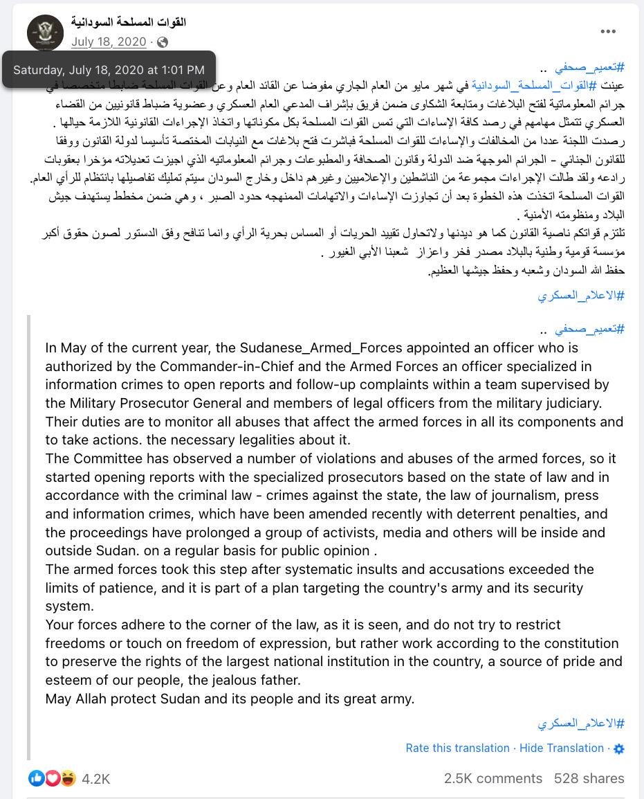 ATLANTIC COUNCIL ٢٠٢٢ ٢٠١٩ ،نادوسلا في ةرقتسم يرغلا تامولعلما ةئيب 14 تامولعملا لوح ةينادوسلا نيناوقلل ةعئاشلا تاداقتنلاا زكرت تافيرعت دوجو مدع لىع لولأا ماقملا يف ةفاحصلا ةيرحو ةبذاكلا تافيرعتلا يف صقنلا اذه 83.ذيفنتلل ةلباق ةغل نمض ةحضاو لاجملا حيتيو ،ةطلسلا يف مه نم حلاصم يمحي ةسوململا نم مهدض نينطاوملا يمحت نأ ضرتفي يتلا نيناوقلا مادختسلا لبق نم اهلهاجتو نيضراعملا دض يفسعت لكشب اهقيبطت للاخ 84.نيديؤملا ١٩٩١ ةنسل يئانجلا نوناقلا تامولعملا رشن ١٩٩١ ماعل يئانجلا نوناقلا نم ٦٦ ةداملا تمرج لىع ريثأتلا« وأ »ماعلا ملسلا ديدهت« يف ببستلا دصقب ةبذاكلا نوناقلا اذه بجومب مهتنادإ تبثت نيذلا كئلوأ .»ةلودلا ةبيه 85.امهيلك وأ ،رهشأ ةتس نجس وأ ةمارغل نوعضخي ٢٠٠٩ ماعل تاعوبطملاو رشنلا نوناق سلجملاب فرعي ام ٢٠٠٩ ماعل تاعوبطملاو رشنلا نوناق أشنأ ليومتو فارشإ تحت (NCPP) تاعوبطملاو ةفاحصلل ينطولا بجي تاعوبطملا عيمج نأ لىع نوناقلا صنو86 .سيئرلا بتكم عيمج نأو موسرلا عفد دعب NCPP لبق نم ةصخرم نوكت نأ .مهتنهم ةسراممل NCPP ىدل اولجسي نأ بجي نييفحصلا لكشب تاطلسلا تماق ،٢٠١٩و ٢٠١٨ نيب ةيروثلا تاجاجتحلاا للاخ امك ؛اهقيلعتو ةيملاعلإا تاعوبطملا لىع ةباقرلا ضرفب ينيتور ،رهاطلا ايلاد ةلقتسملا ةيفحصلا بسحبو 87.نييفحصلا اولقتعا فادهتسلااو ديدهتلل نوضرعتي نوينادوسلا نويفحصلا لازي لا ،٢٠٢٣ رياني ١٥ ،Beam Reports ،»نادوسلا في ةئطاخلاو ةللضلما تامولعلما ديدحت « ،Share Mania 83 https://www.beamreports.com/2023/01/15/share-mania-mapping-misinformation-and-disinformation-in-sudan/ ،٢٠١٩ سطسغأ ٢٨ ،Global Voices ،»نادوسلا تامولعلما لىإ لوصولا نوناق حلاصإ ةيضق« ،نمايلس دمحم 84 https://globalvoices.org/2019/08/28/the-case-for-reforming-the-sudanese-access-to-information-act/ https://www.wipo.int/wipolex/en/legislation/details/10737 ،١٩٩١ ةنسل تابوقعلا نوناق نم ٦٦ ةدالما 85 https://moj.gov.sd/sudanlaws/#/reader/chapter/305 ،٢٠٠٩ ماعل شرنلاو تاعوبطلما نوناق نم )١( ٧ و )١( ٦ ناتدالما 86 ،٢٠٢١ برمتبس ٢٠ ،Sudan News Agency ،"ةحيصلاو ةهابتنلاا تيديرج رادصإ قلعي تاعوبطلماو ةفاحصلا سلجم" 87 ،٢٠١٩ ريابرف ١٤ ،Reporters Without Borders ،"نادوسلا في تاجاجتحلاا نم نيرهش في ايفحص ٧٩ نع لقي لا ام لاقتعا" .https://www.suna-news.net/read?id=723089 https://rsf.org/en/least-79-journalists-arrested-two-months-protests-sudan ٢٠٢٢برمفون ١٧ ،تنترنلإا برع رهاطلا ايلاد عم ةلباقم 88 ،٢٠٢١ سطسغأ ٢٤ ،Radio Dabanga ،»موطرخلا موجه في حبرلما بضرلل ضرعتي نيادوس يفحص“ 89