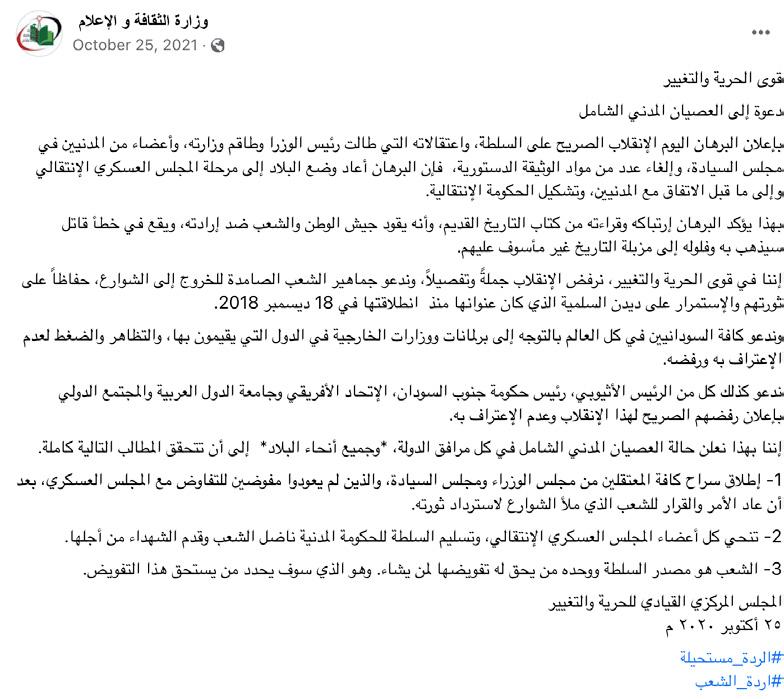 بلاقنا ةلواحم طابحإ مت هنأ كودمح نلعأ ،٢٠٢١ ماع ربمتبس ٢١ يف اوناك نيذلا »قباسلا ماظنلا لولف« لبق نم اهريبدت مت هنأ معزي 25».يندملا يطارقميدلا لوحتلا ضاهجإ لىع نيمزاع« رمتؤملا بزحب نيطبترملا نيرهاظتملا فلاآ جرخ ،رهش دعبو اماصتعا اومظنو ،موطرخلا عراوش يف ةيملاسلإا بازحلأاو ينطولا لىع ةرطيسلاب شيجلا نيبلاطم يسائرلا رصقلا جراخ امايأ ماد تارهاظمب تاوعدلا هذه تلبوق 26.يركسع بلاقنا ربع دلابلا تاجاجتحلاا ميظنت مت 27.ةيلاقتنلاا ةموكحلل ةمعاد ةداضم ثيح ،رييغتلاو ةيرحلا ىوق لخاد نم لئاصف لبق نم ةسفانتملا بلاط قشنم ليصفو كودمح ةموكح يساسلأا ليصفلا معد 28.ةتقؤملا ةموكحلا لحب ثيح :طبضلاب كلذ شيجلا لعف ،٢٠٢١ ربوتكأ ٢٥ يف ،مايأ دعبو ةينادوسلا ةموكحلا لح نع زفلتم باطخ يف ناهربلا نلعأ مل ةوطخلا هذه نأب ءاعدلاا نم مغرلا لىع .ئراوطلا ةلاح ءدبو لاقتنلاا وحن »راسملا حيحصتل« ةلواحم تناك لب ابلاقنا نكت 29.نادوسلل يلعفلا سيئرلا ناهربلا حبصأ ،يطارقميدلا ةماقلإا ديق عضو لب ،كودمح لىع ضبقلا متي مل هنأ ناهربلا ركذو ةفاقثلا ةرازو تردصأو 30.هسفن شيجلا دئاق لزنم يف ةيربجلا يندم نايصع لامعأب مايقلا لىإ نينطاوملا هيف تعد انايب ملاعلإاو .عراوشلا لىا لوزنلاو