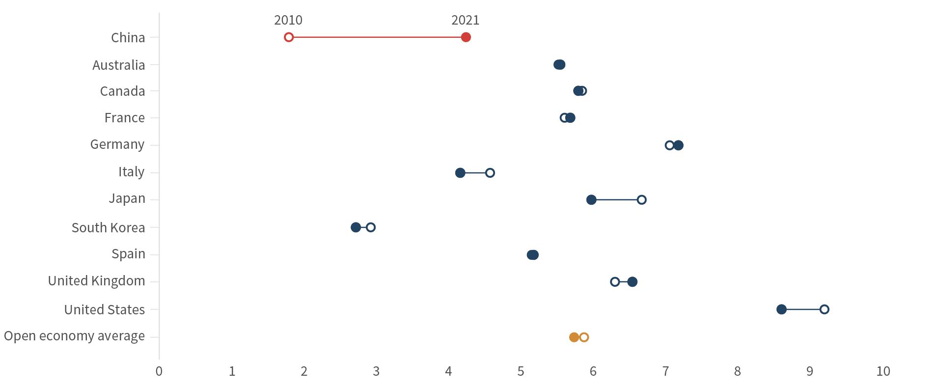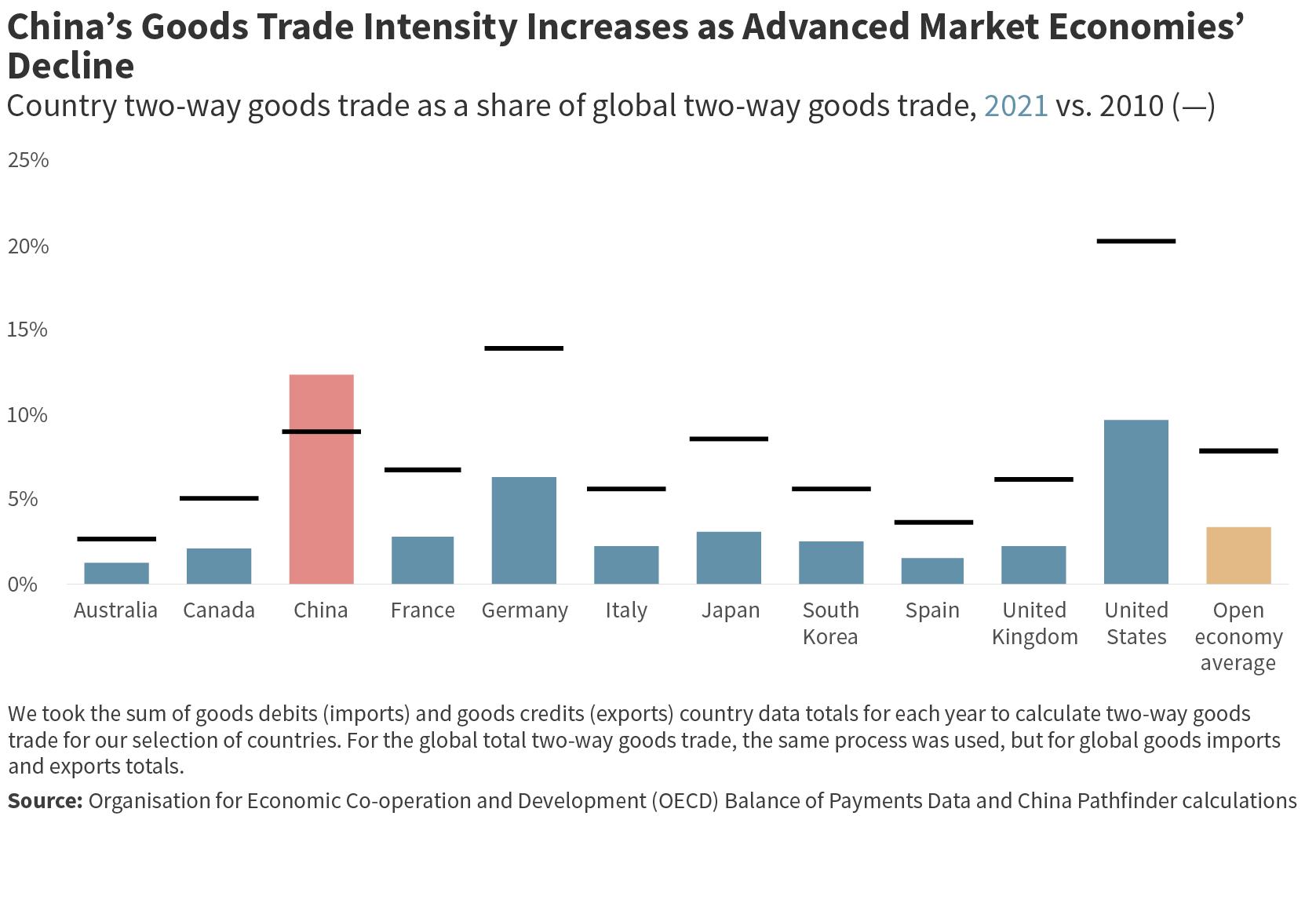 To broaden our research framework and minimize the noise intro duced by pandemic-related disruptions, we decided to take a lon ger view in this annual report and made several important updates to our methodology. First, we added the 2010 baseline for all open economies in our sample. Though the focus of our project remains tracing China’s trajectory, tracking the evolution of Organisation for Economic Co-operation and Development (OECD) economies over the same period can teach us valuable lessons about the overall trendlines in the global economy. Market concentration, for exam ple, has been on the rise around the world, provoking intense debates about fair competition and access. Second, we conducted a complete audit of the indicators we use for our composite scores and retired several which were discontinued or were not updated in time for inclusion in our analysis. Finally, to ensure data remain compatible between the years for which we conducted the stock taking, we recalculated indicator and composite scores any time we replaced or retired an indicator. The latest methodology and infor mation can be found at https://www.chinapathfinder.org/ and in the Appendix.