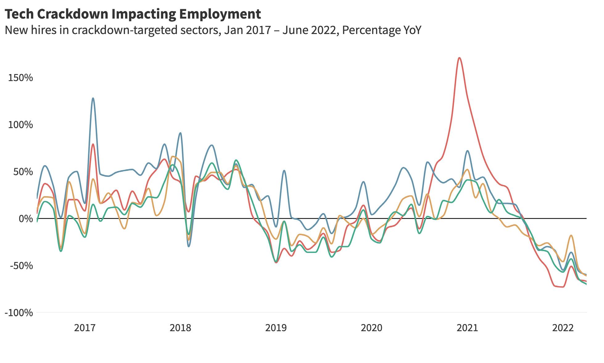 Meanwhile, the government’s regulatory crackdown intensified. By the end of 2021, a broad swath of data-heavy, platform economy companies, including food delivery, gaming, finance, and entertain ment, had been targeted by the government. One industry, private education and tutoring, was forced to become not-for-profit.