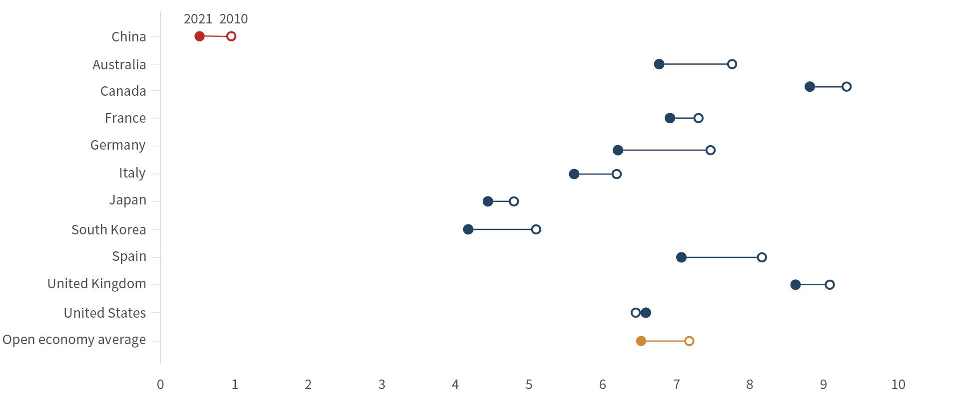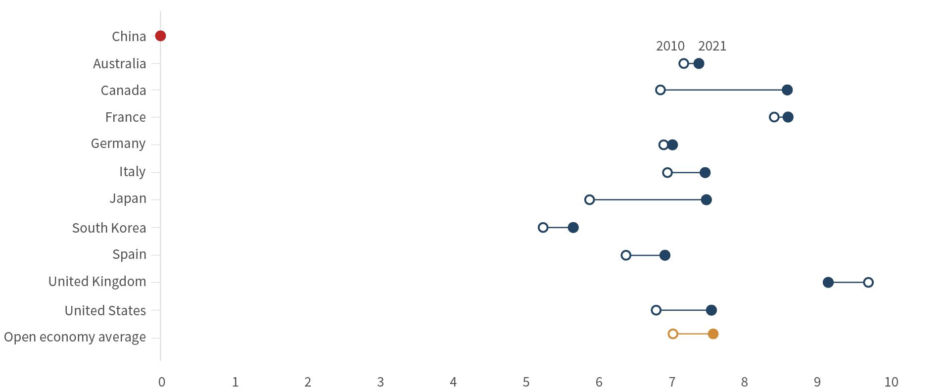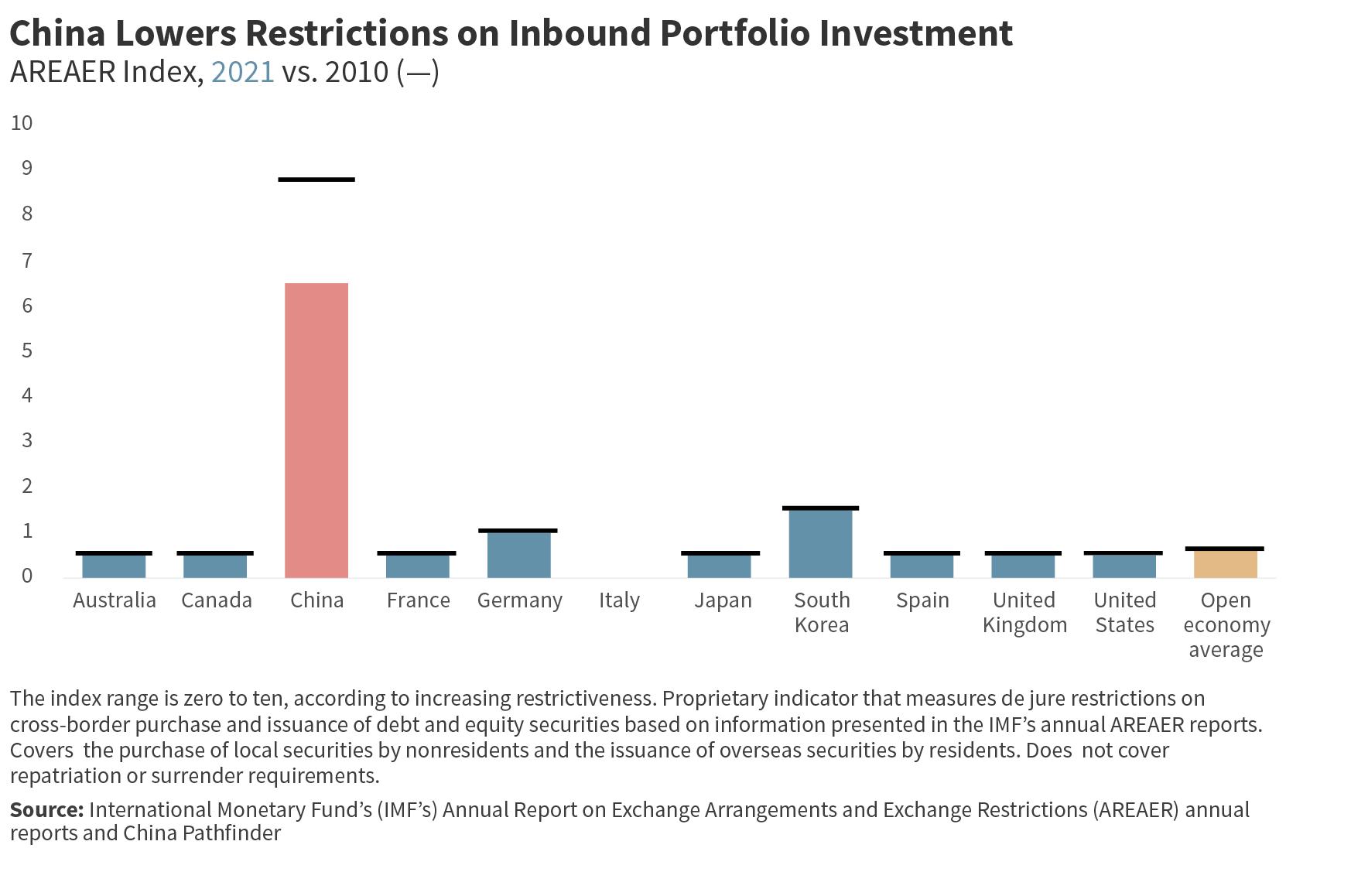 • China’s investment openness has decreased since 2020, with a small slump in cross-border equity and bond volumes, as well as a drop-off in outbound FDI volumes. Though China’s restrictions on direct investment and portfolio investment have not changed, other factors such as the crackdown on technol ogy firms and zero-COVID lockdowns have discouraged invest ment. As China’s scores in both areas of investment openness have been the furthest from market economy norms since 2010, the latest signs don’t do much to alter the dim picture.