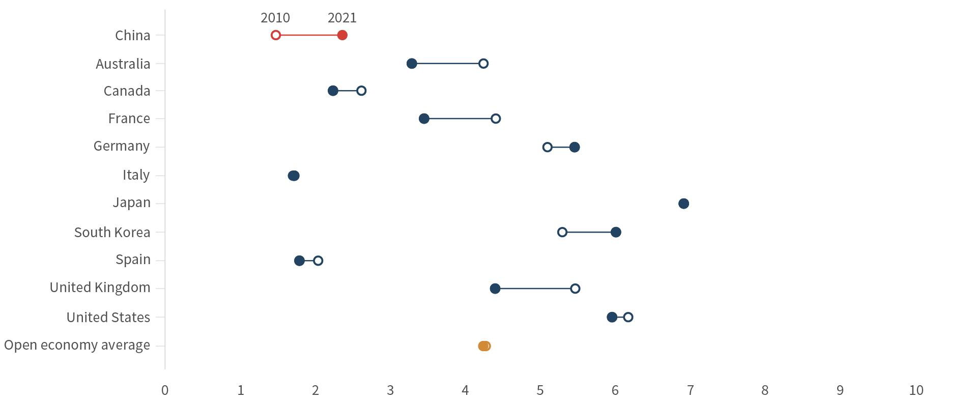 That is true for China, as well as the rest of the world. We designed China Pathfinder as a multi-year project to track the progression—or regression—of the Chinese economy over time and compare it to the world’s largest open market economies. While it is true that the study of the other largest economies was never the primary objec tive of this work, our research can pinpoint when they start moving away from open-market norms.