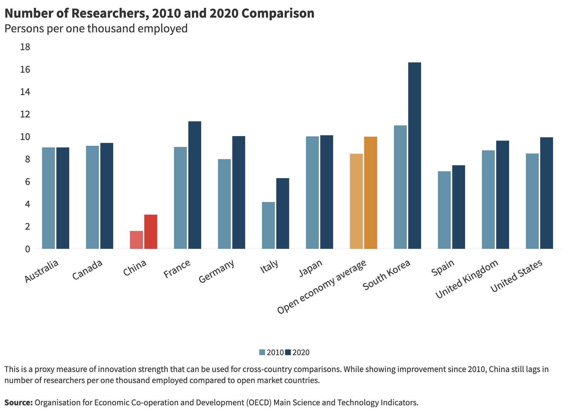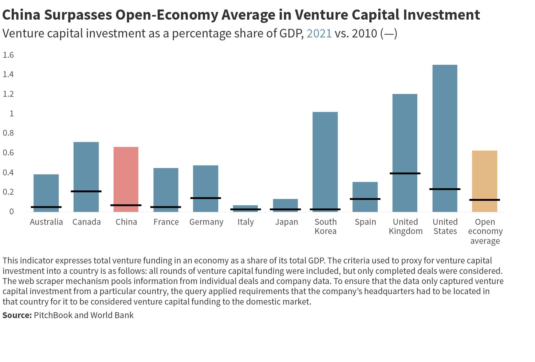 • In innovation, China had a higher composite score than Canada, Italy, and Spain. It also surpassed the open econ omy average in venture capital investment intensity. However, this progress comes with caveats. The role of the state in