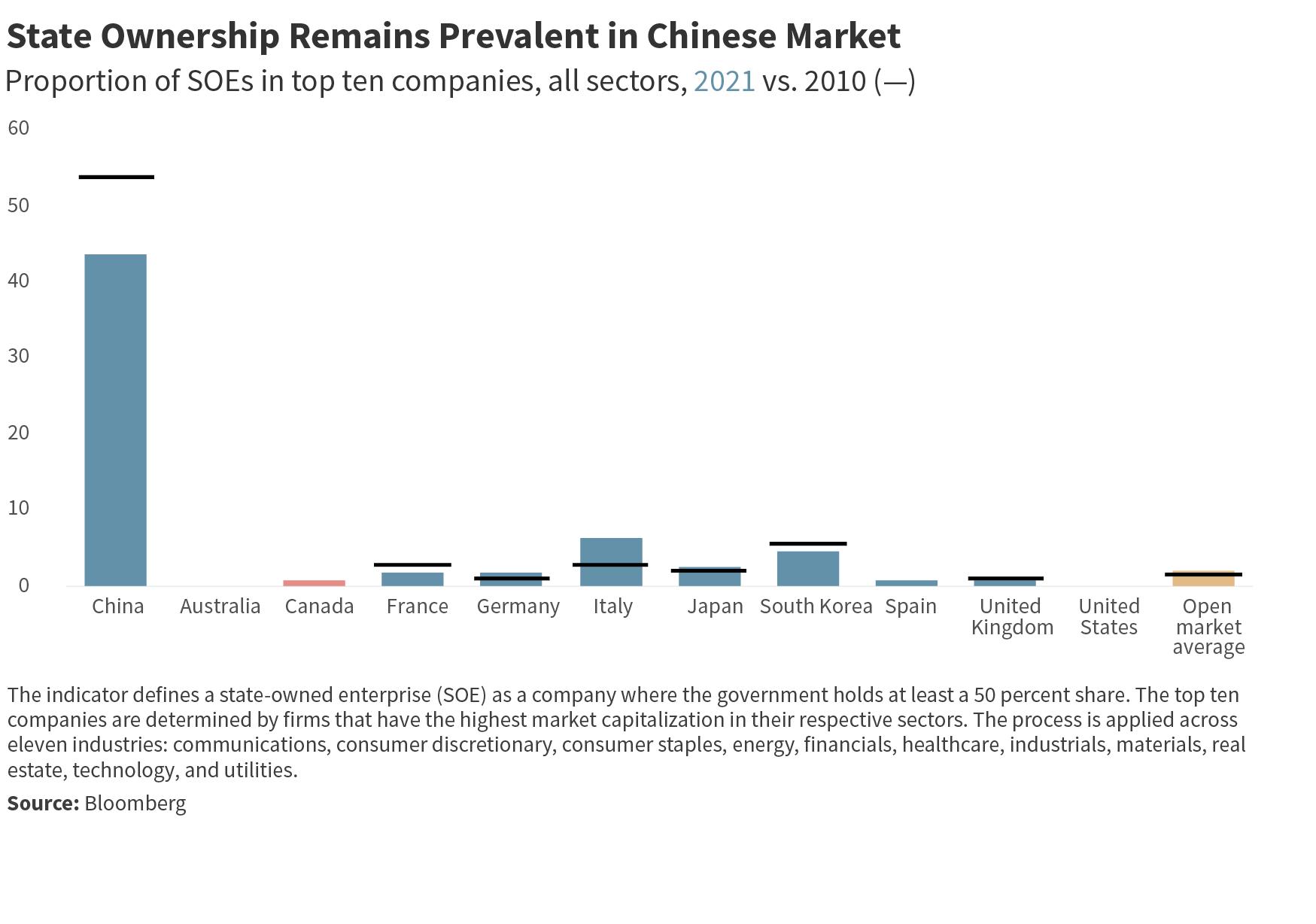 • Our data approach cannot fully account for the unlimited reach of the state and the role of the Communist Party in influencing prices, competition, and outcomes in the Chinese economy. While we assess measurable elements such as the proportion of top 10 financial institutions by market capitalization that are stateowned, these measures certainly understate the role of politics in the economy—as 2021’s extralegal changes to the role of pri vate ownership in the education-services sector (one of many examples) demonstrate.