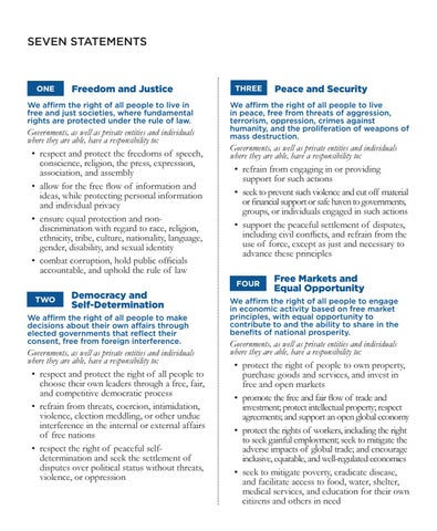 Governments, as well as private entities and individuals where they are able, have a responsibility to: • respect and protect the right of all people to choose their own leaders through a free, fair, and competitive democratic process • refrain from threats, coercion, intimidation, violence, election meddling, or other undue interference in the internal or external affairs of free nations • respect the right of peaceful selfdetermination and seek the settlement of disputes over political status without threats, violence, or oppression