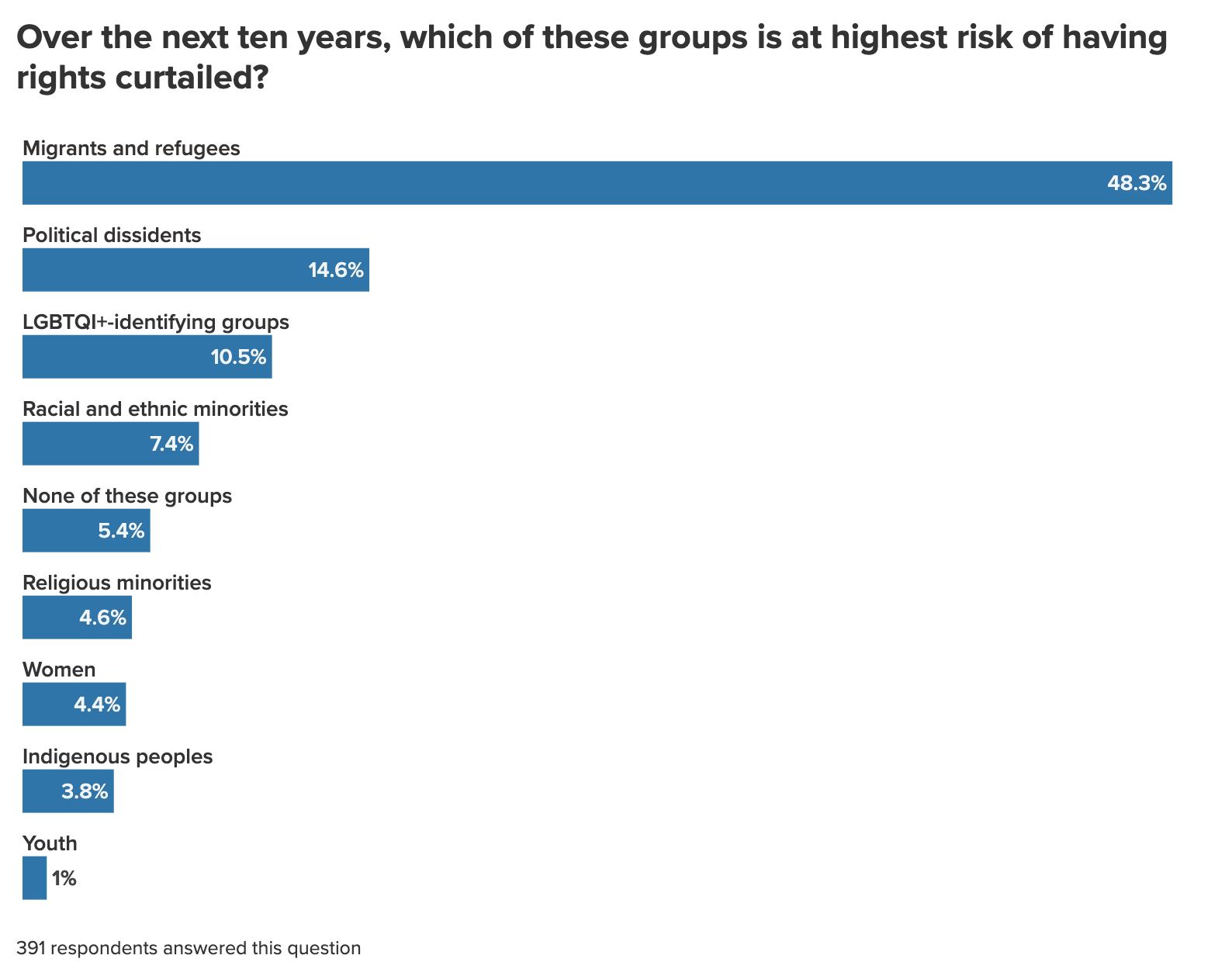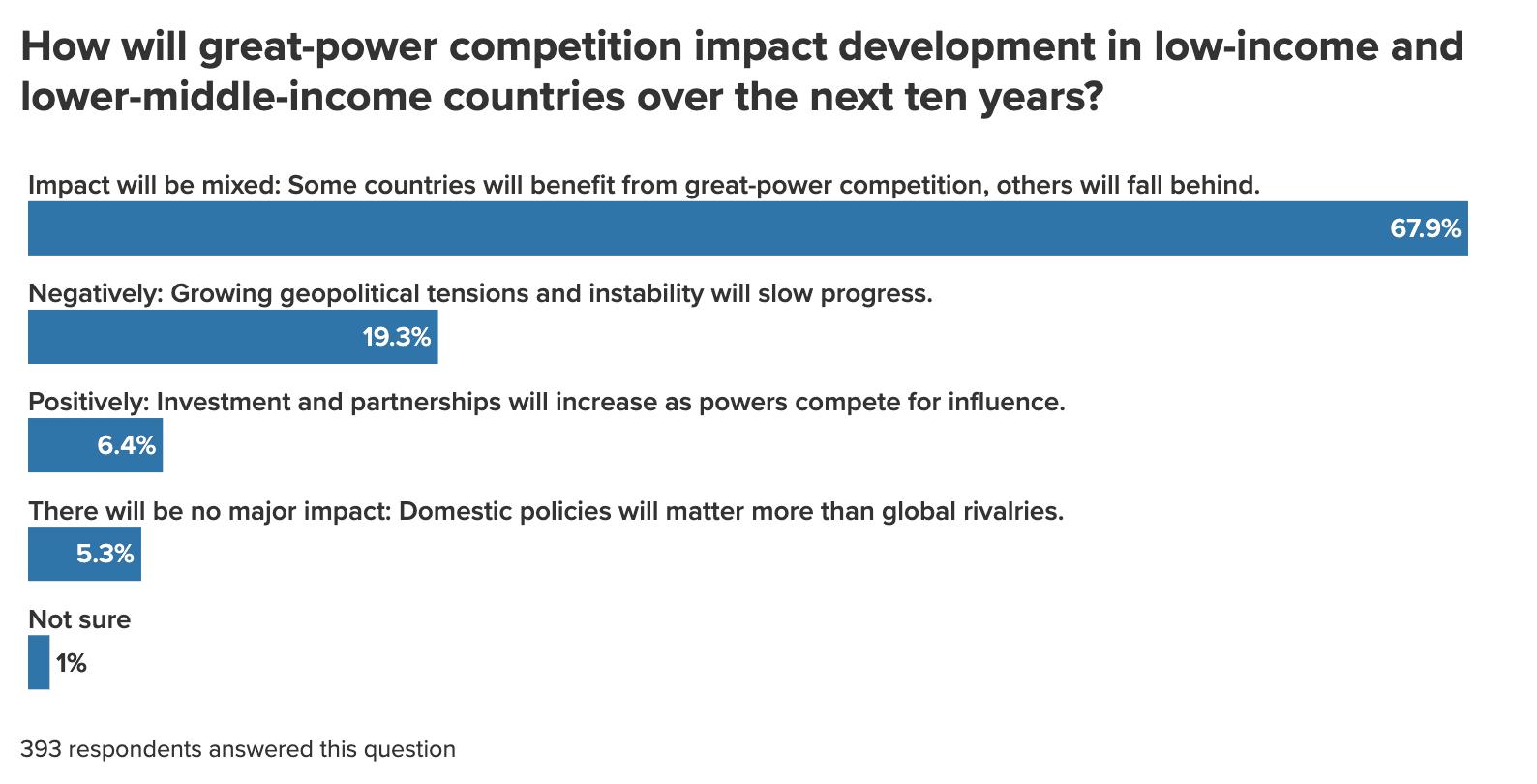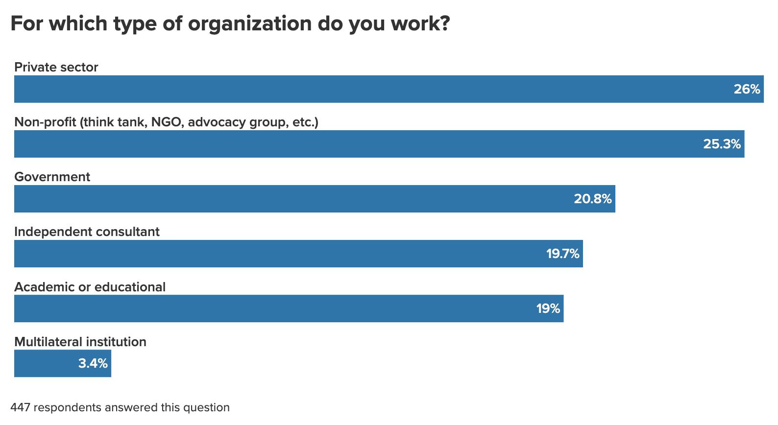 The 447 survey respondents were citizens of 72 countries—the highest number of countries represented in the four years we’ve been conducting our annual Global Foresight survey.1 Roughly half were citizens of the United States, more than one-fifth were from Europe, and just under a fifth were from countries in the so-called Global South. Respondents skewed male and older (roughly three-quarters were male and a similar proportion were over 50 years of age) and were dispersed across the private sector, nonprofits (think tanks, advocacy groups, non-governmental organizations), government, academic or educational institutions, independent consultancies, and multilateral institutions.