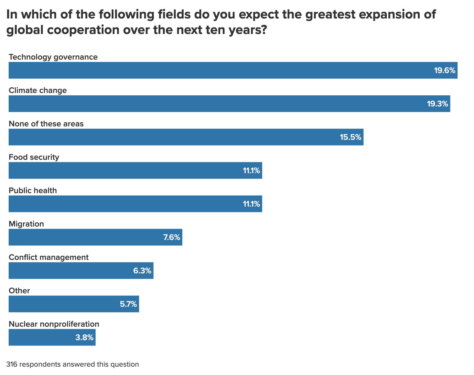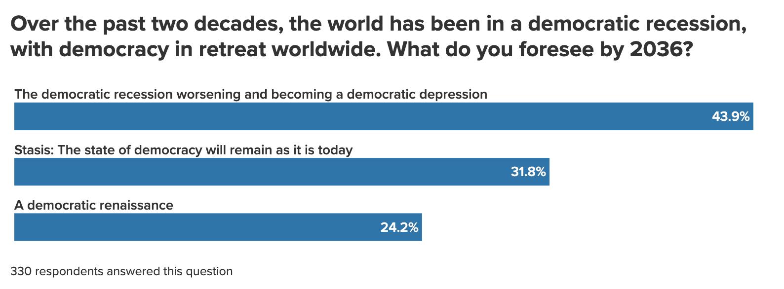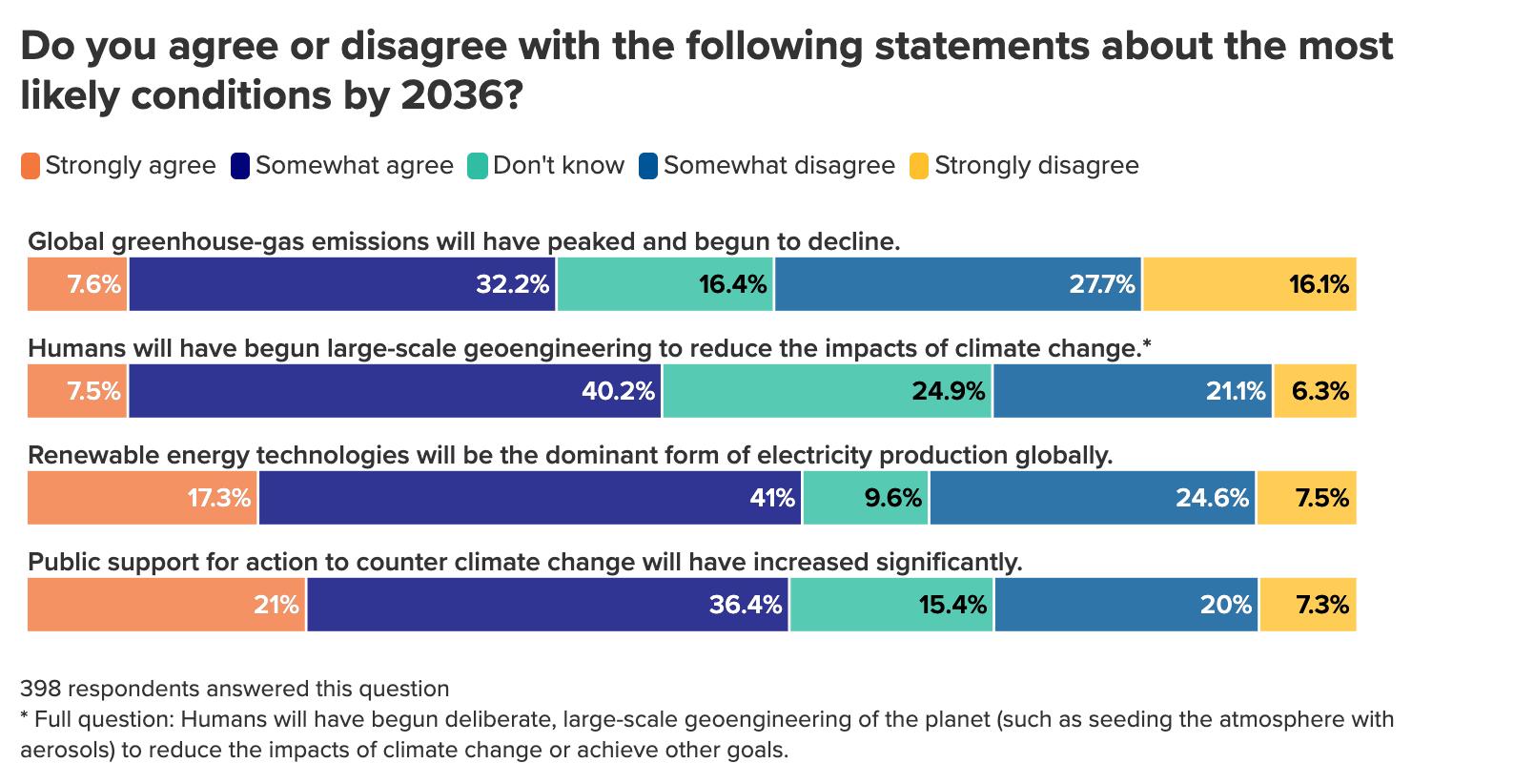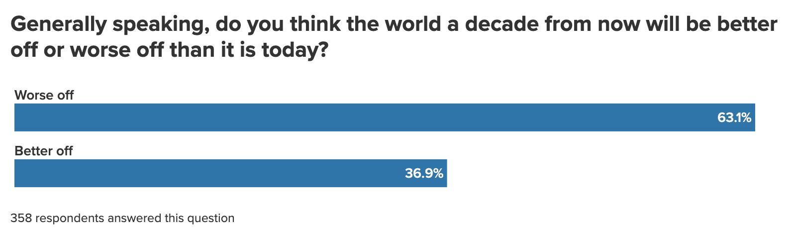 We found respondents generally in a dark mood, with 63 percent expecting the world in 2036 to be worse off than it is now. Just 37 percent think that it will be better off ten years hence—roughly on par with the results of this temperature-check question in the previous year’s survey.